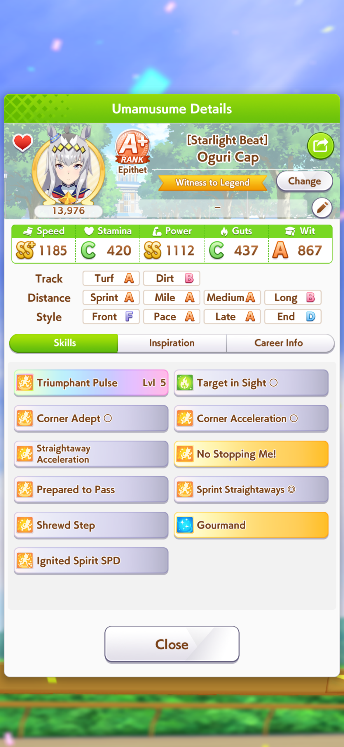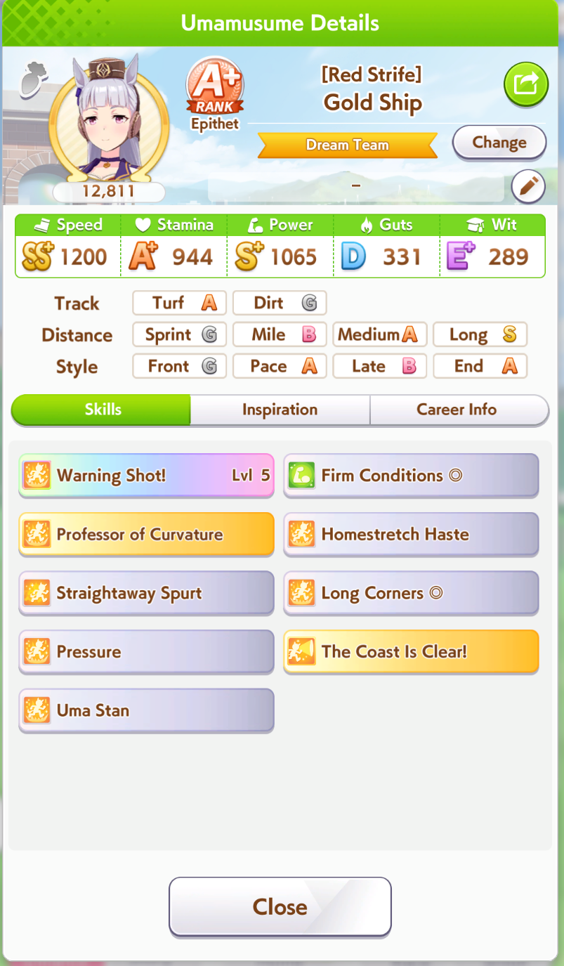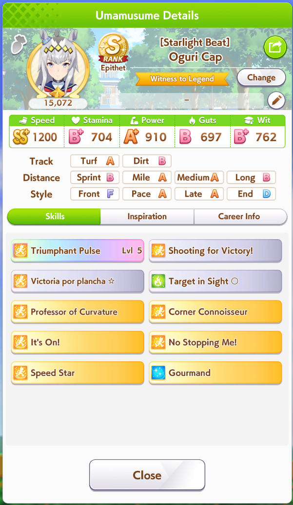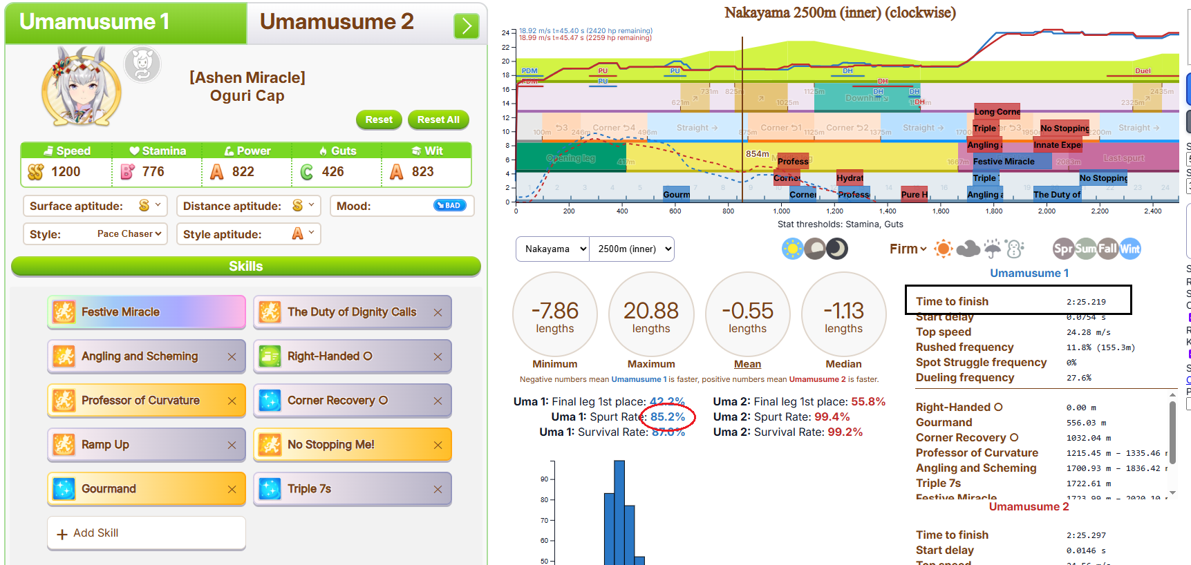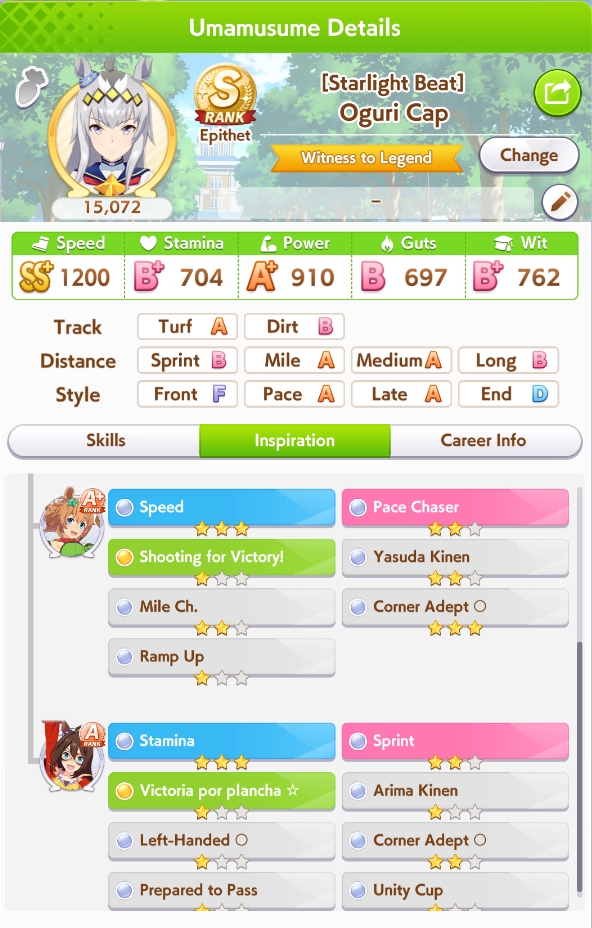 Результаты от двух Огурей. Первая с Эс лонг и 1100спд - 3 победы 2 вторых места. Вторая - 1200 спд, без Эс, 4 рекавери для страты с проком в середине гонки. Остальные статы примерно равны. 3 вторых места, всё остальное в говне. Мой вывод по супер охуенной выборке из 5 гонок на каждой - Эс на дист решает. Делайте с этой статой чего хотите. Огурец сила, но собрать его это да. Легче Голшипа притащить.