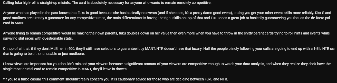 1. ульт активируется рано. По факту- ульта Саммер Мару. огурец подбегает к фронту, перегоняет его и активирует A&S. 2. ульт активируется к лейтгейму - A&S может не прокнуть, но полноценное ускорение легко перекроет это и забег побеждается чуть ли не гарантированно 3. ульт активируется на ласт спурте. По факту - ульта ванилла Огури. Здесь шансов меньше всего, и здесь мог бы зарешать NSM. Но для этого нужно, чтобы был хороший такой блоб из пейсов и фронт раннеров, чтобы было об кого блокироваться. А по факту в командах дохуя энд клосеров/раянов итд, и часто огуря вообще с самого старта на первом месте пейсером бегает.
