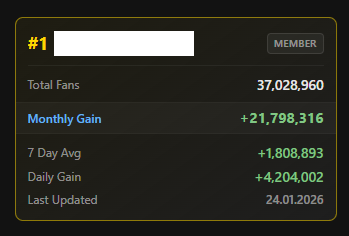 >>6329487 >Чтобы апнуть ульту у лошадки нужно 50к фанов к февралю, 70к к апрелю. 120к к концу декабря. Только не 50 а 60к кажись. У меня при 50 не апается всегда стараюсь 60 нафармить до февраля.