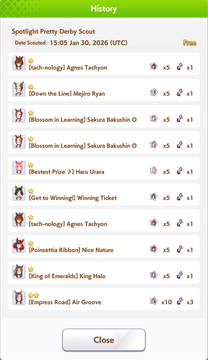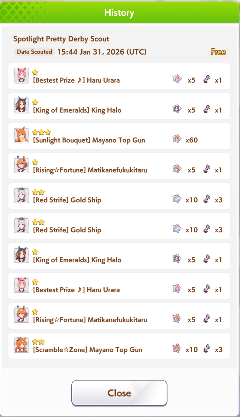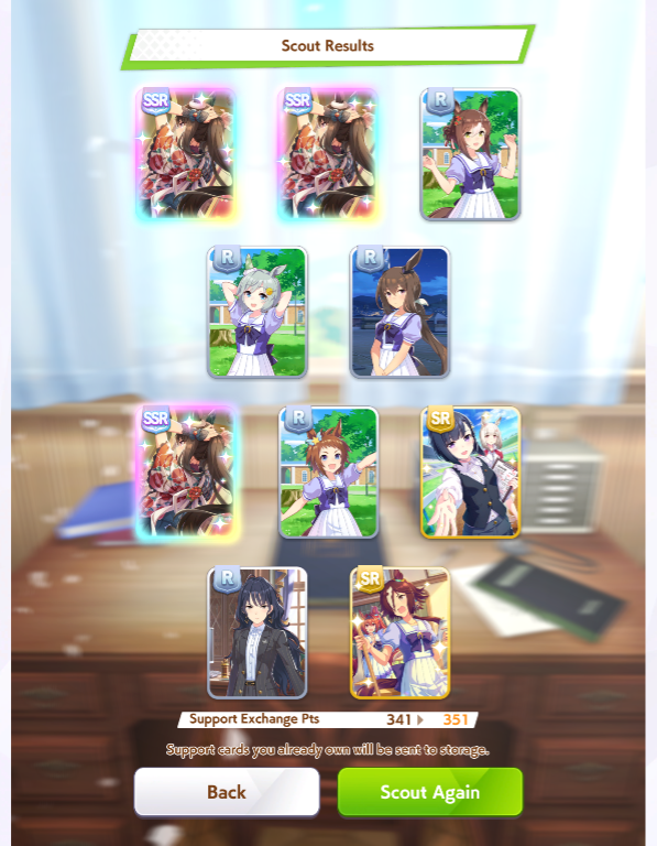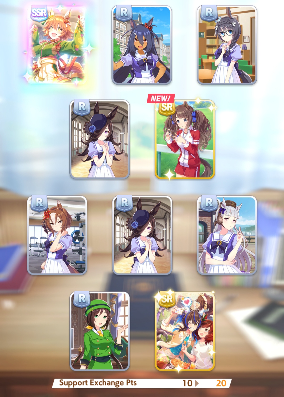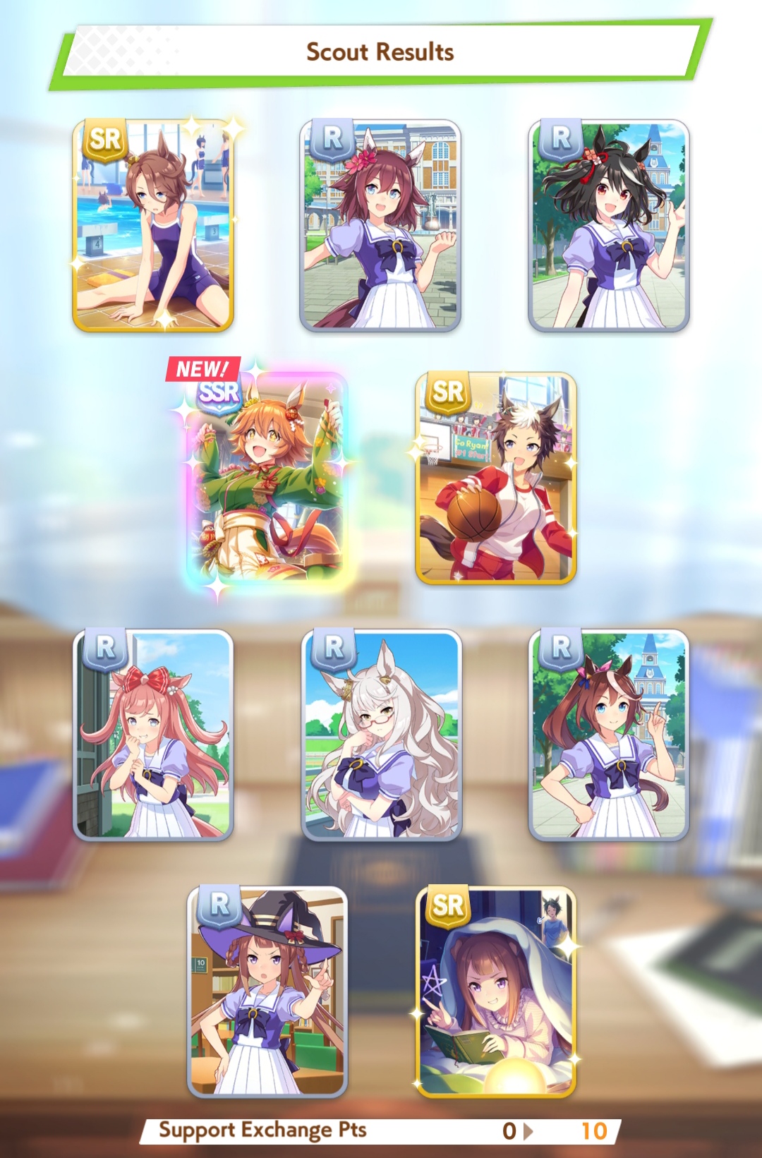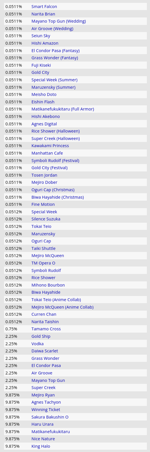 за 1000 круток +- получить целое нихуя из 1лб рики и 1лб файнмошен после реролла на китасан это сильно, так еще и лошади только с пити падают, зато обычная тейо в одной копии от 5 звезд.