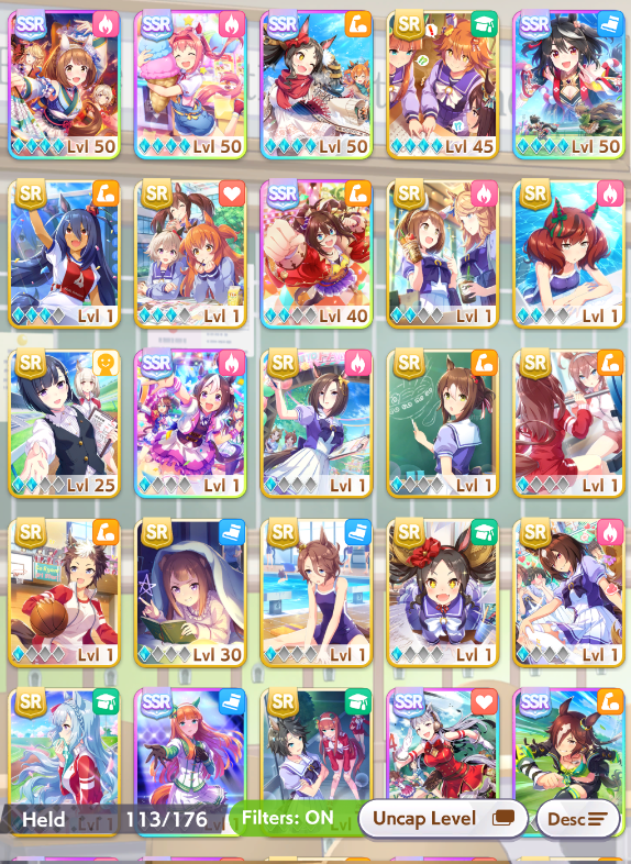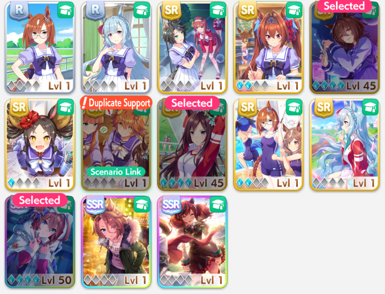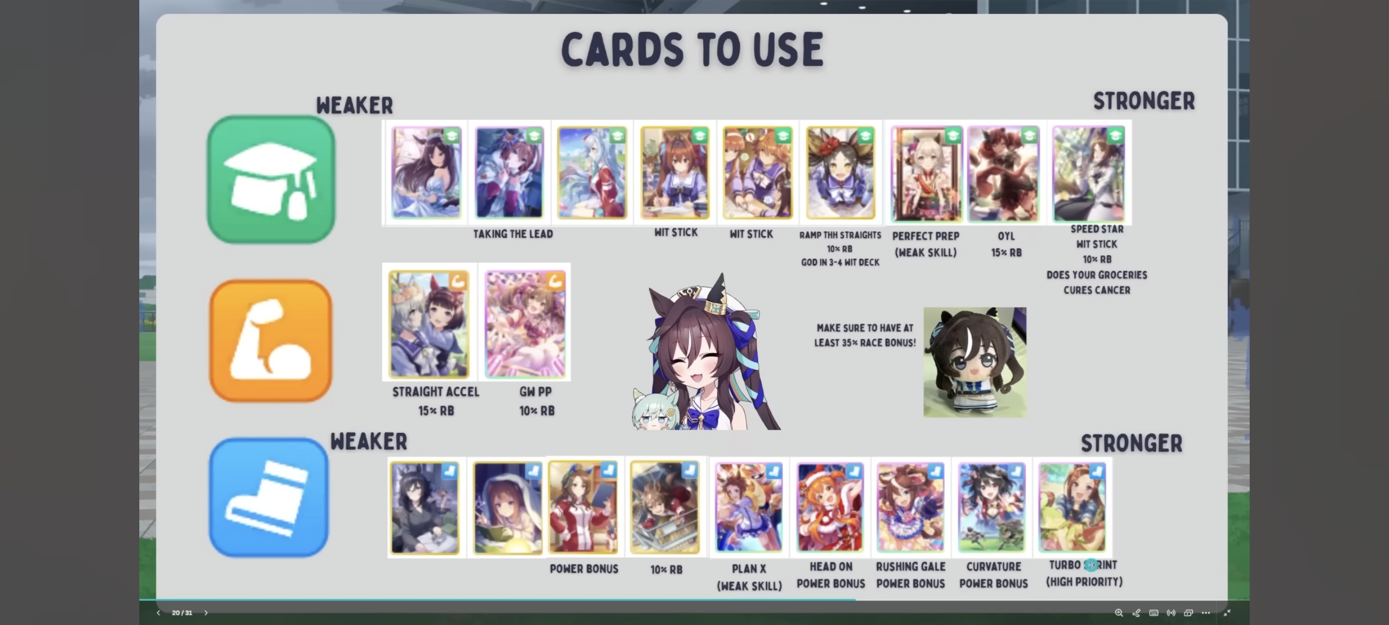 Карты примерно лучшее из того что есть. Т.е. особо лучше уже не будет. Совет играть с двумя картами на спид не особо котируется, ибо 1200 спида буду видеть раз в месяц примерно. Выкидывать Тазуну тоже не вариант как видится, ибо что вместо неё ставить, ивентовую карту Сузуки на стамину с концентрацией? Учитывая что по всей видимости входной порог в Б финал на этот чм будет 1200-1000-1000 еще и гатса дохуя. Короче полная жопа. Хотелось бы узнать ну и куда мне с этим идти и че делать? Инб4 нахуй.