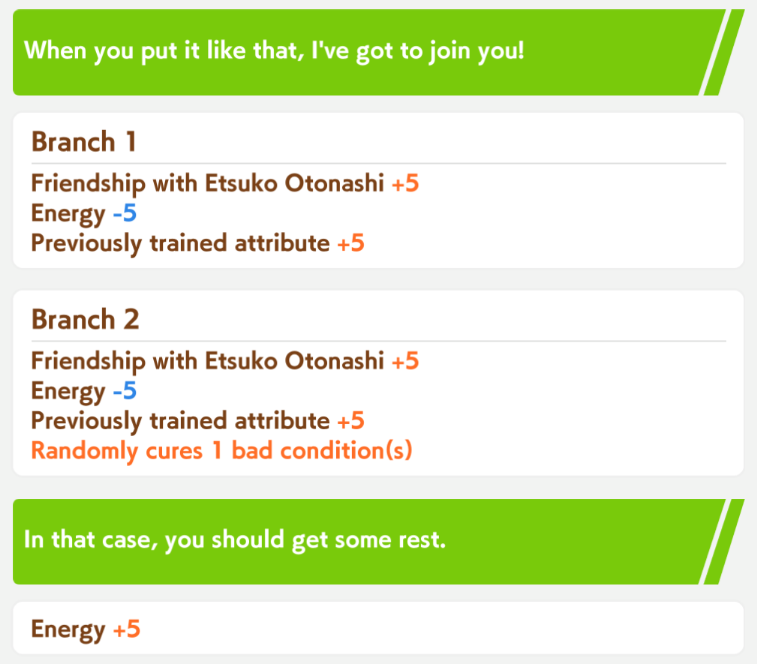 >>6328767 От +2 до +5 стата если на тренировку попадает в зависимости от уровня дружбы, ну и в конце при высоком уровне еще чуть насыпет статов и скилпоинтов. Оно как бы не много но и на дороге не валяется. Допустим у тебя тренировка на +20, а с ней это уже +25 если дружба прокачана.
