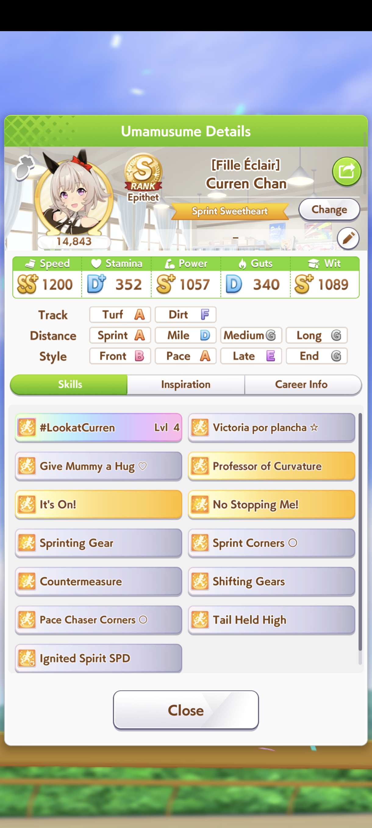 Моя первая S-ка. Почти все сложилось идеально, кроме салфеток вместо подарка и проебанной финальной тренировки с 1%. Но фатальным косяком оказалось ноль розовых спарков, так что только на тим траялсы дурёха и годится, набрал ей золотых скиллов по итогу. А я ее к СМу готовил, кормил спринтовыми родителями. мимо ньюфаг месячной давности