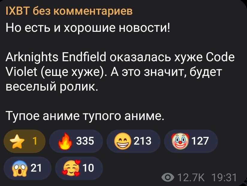 >Жадная гача, лудкотряска, душка завод. Это наименьшие проблемы игры (что так копил в старых ушках, что здесь буду), я не ебу что думали грифы когда делали эту игру (хотя завод это охуенно, единственный аспект игры где они реально постарались, сделать не на отъебись) В итоге получили душную хуйню для нормискота, где нужно ебать заводы по несколько часов, максимально блеклую, срущую на весь бренд аркнайтс(тм) историю, которая отпугивает тех кто пришёл со старых ушек, и боевку говна Для какой аудитории этот максимально усредненный корпокал - не ясно