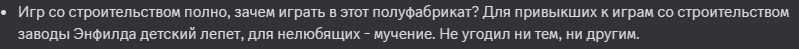 >>6275607 Человек, любящий заводы и играющий в факторию, просто проблюется с местного строительства. Он это имел в виду. В итое проект непонятно для кого. Тут либо заводы сносить, либо делать их глубже и сложнее. Но тогда непонятно зачем ролить персонажей. Короче, дурка.