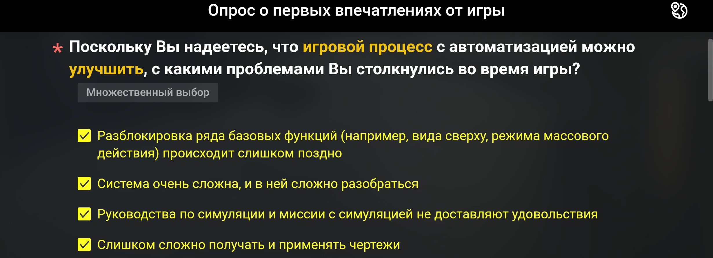 >>6274723 Чел, ну вот давай серьезно. В нынешнем виде заводы хуевые даже по меркам заводов. Ебут туториалами, свободы нет, иди собирай хуйню для открытия рецов, да еще и за сюжеткой все залочено. Тут либо открывать сразу все, либо привязывать анлоки логично к сюжету. В нынешнем виде это какой то дроч.