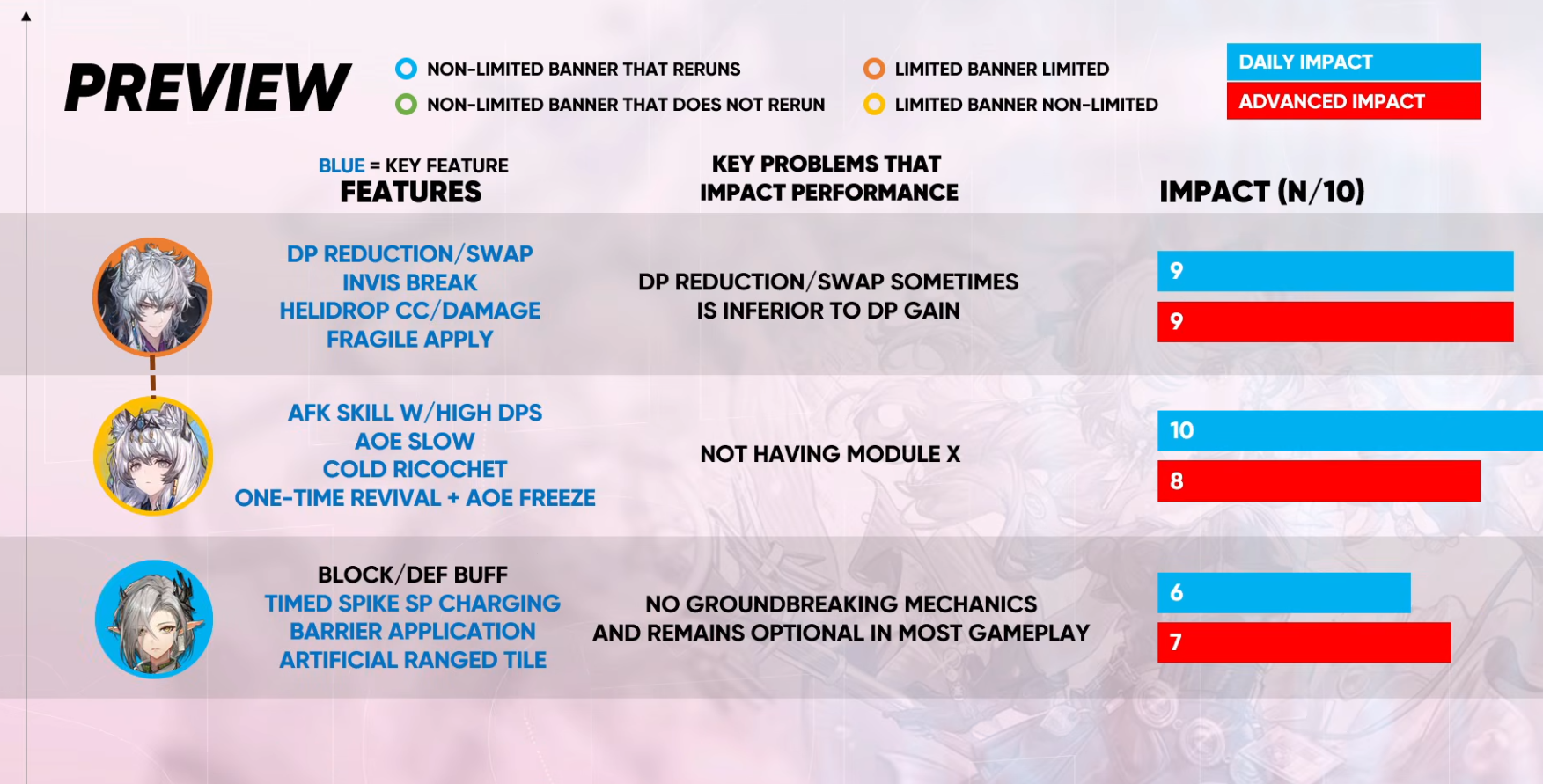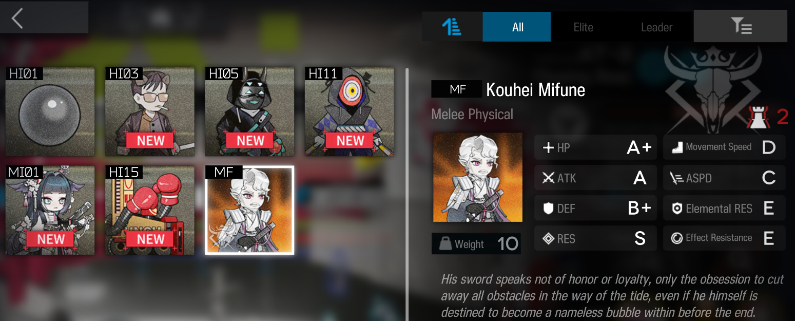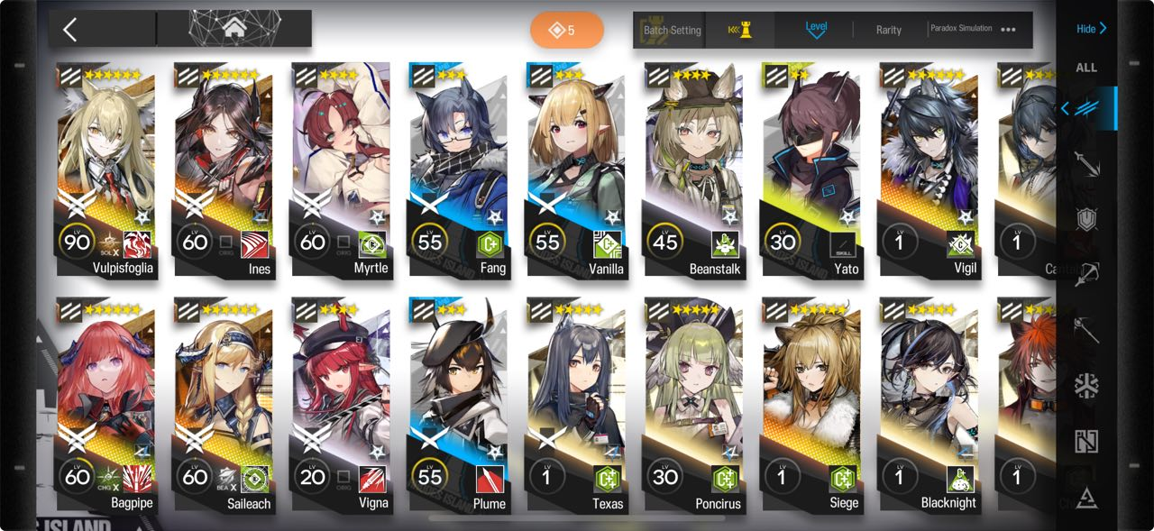 5★: Kirara / Corroserum / Whisperain / Andreana / Zima / Blue Poison / Silence / Meteorite / Skyfire / Liskarm / Astesia / Pramanix / FEater / Firewatch / GreyThroat / April / Nearl / Beeswax / Franka / Provence / Hung / Swire / Sesa / Tsukinogi
