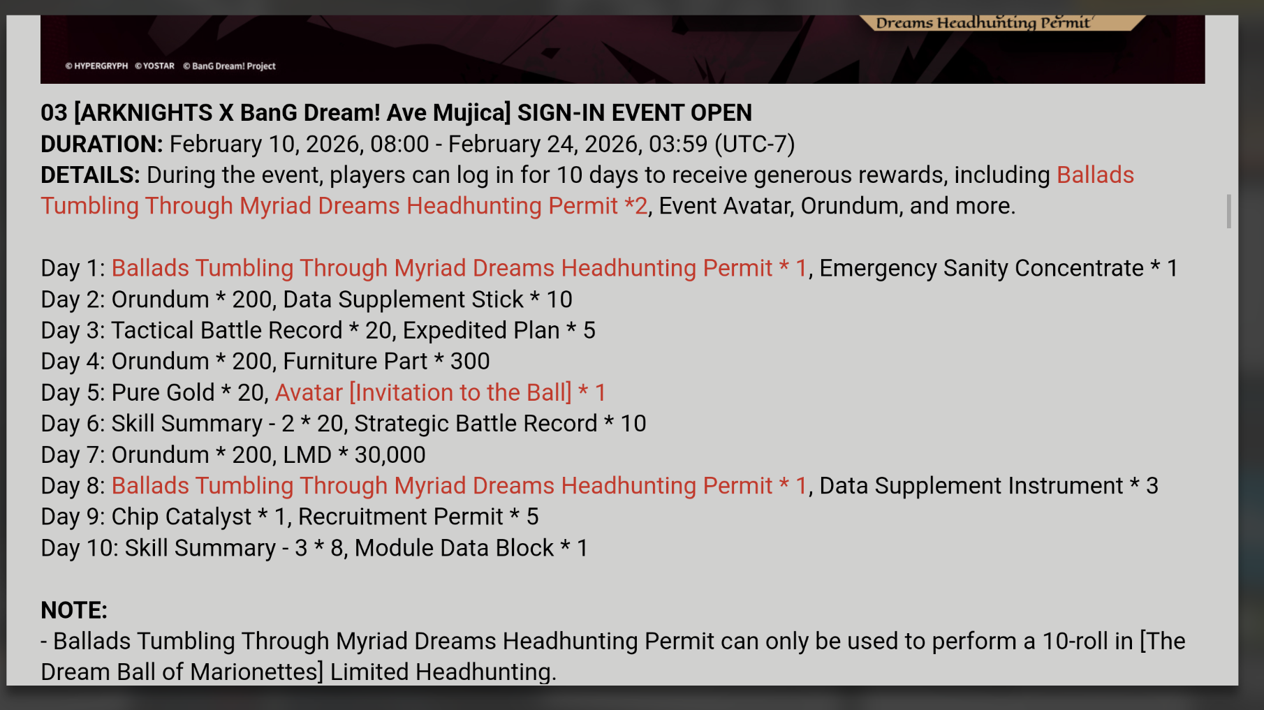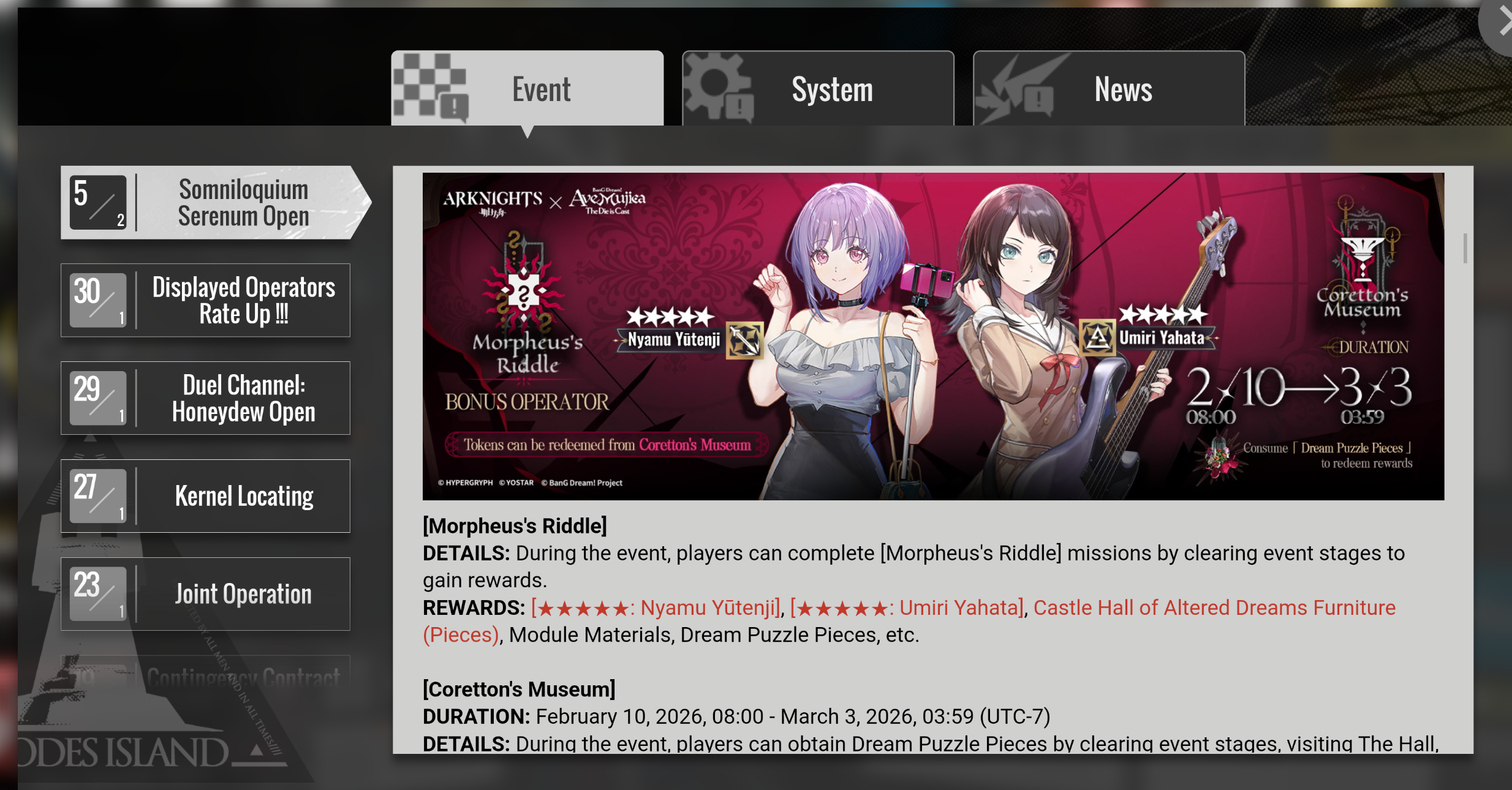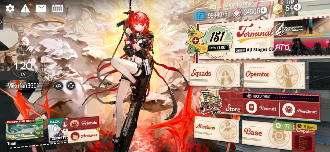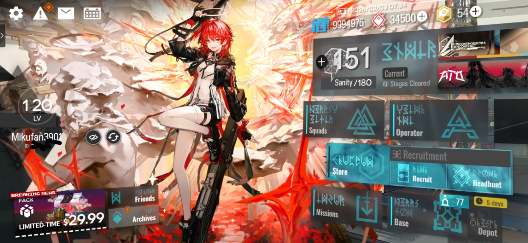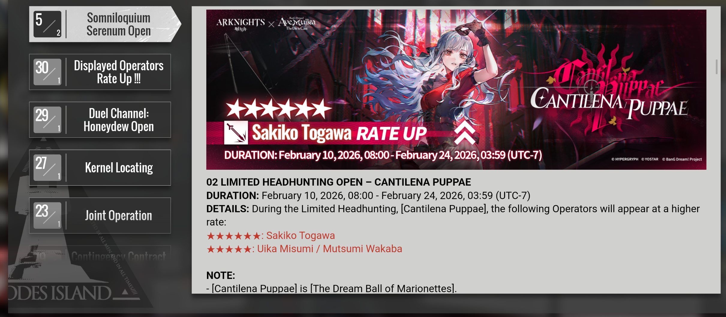 16 января начался ивент шестой годовщины глобального сервера «[Side Story – Carnival] Ato». Вместе с ивентом начался баннер Hanabi Exiled. На ивенте можно получить бесплатного оператора Matsukuri и раздаётся всем отдельно Savage. Также все получат фришные ваучеры на 6★ и 5★ операторов, в том числе ваучер на скин за 15-18 OP