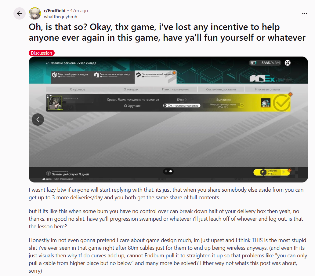 уже чую как геймплей луп заебет через примерно 2 дня слишком дохуя прокликов - тп на 1 корабль сдать одно говно тп на второй сдать второе говно три доставки раскликать со входом в меню на раздачу три словить самому хуе мое цветочки не забудь полить подарки раздать и там еще гдето санити сверху при этом первые полгода дефицит ресурсов будет такой что проебывать лишнюю желтую книжку не захочешь ну никак если фикс всей этой хуйни не заанонсят уже в 1.1 то я умываю руки независимо от любых других переменных