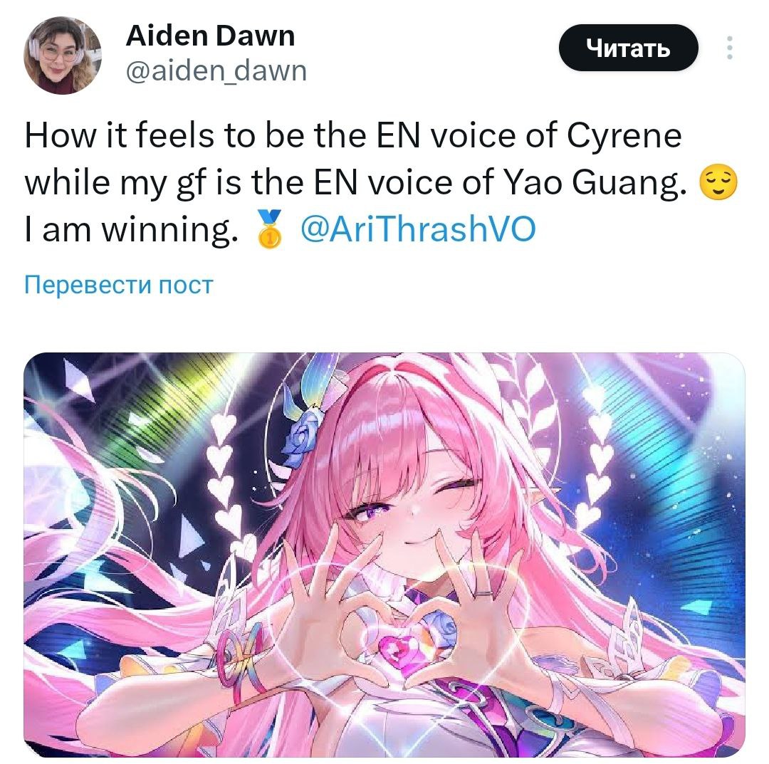 Актриса озвучки Кирены состоит в отношениях с актрисой Яо Гуан: об этом она поделилась в своём твиттере, радуясь тому, что теперь они обе озвучивают персонажей одной игры