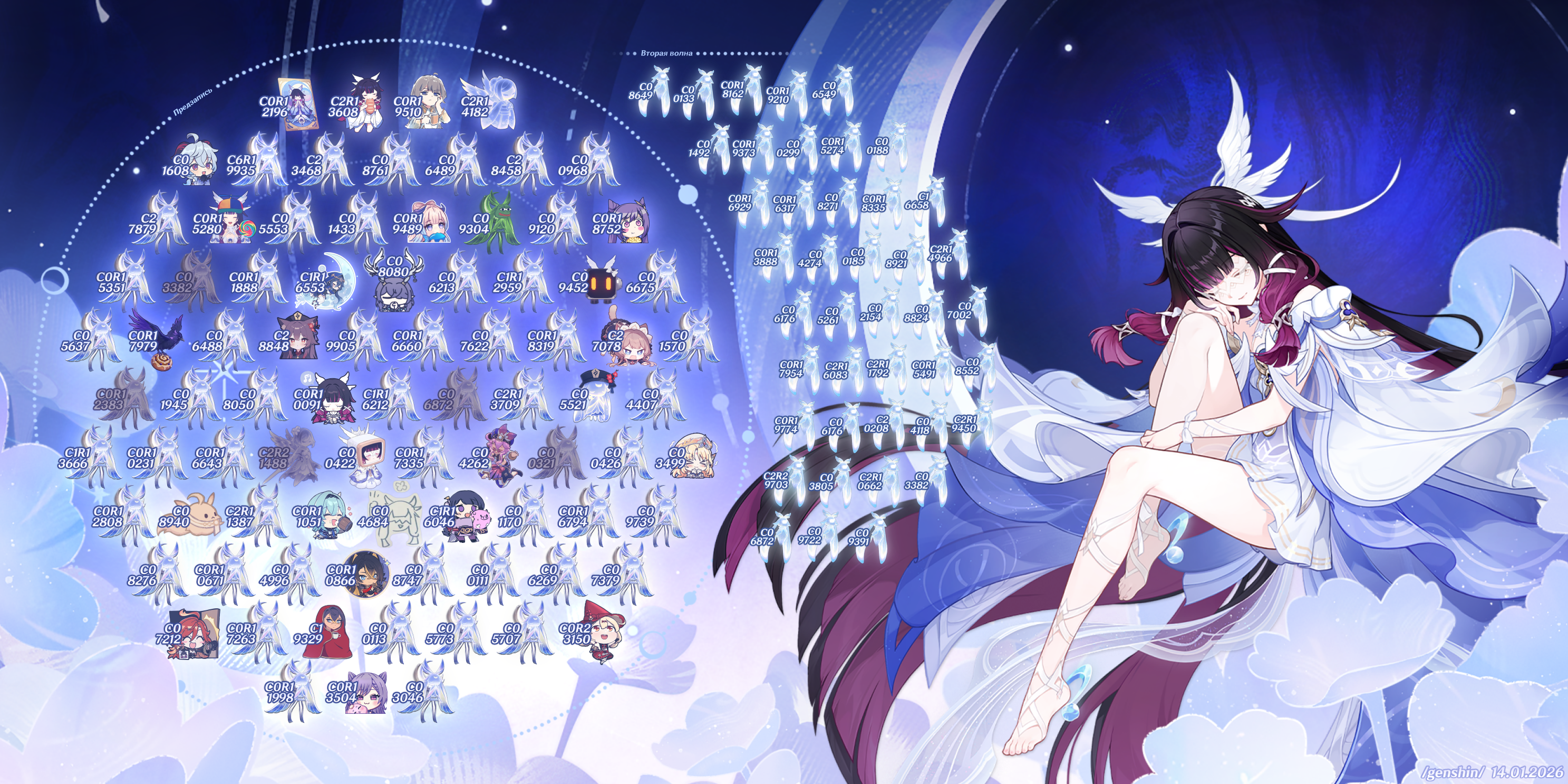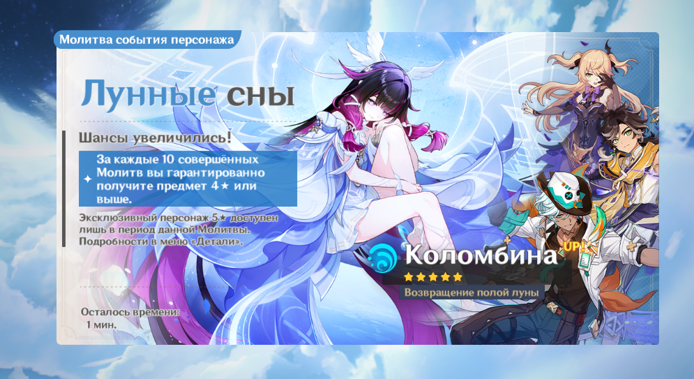 Алтарь Богини Луны - Коломбины Гипоселении. Последние минуты баннера. Рассказать о своих успехах можно со скриншотом, где видны последние 4 цифры UID. Напоминаю что в группе предзаписи можно выбрать свою картинку >>6190926 →.