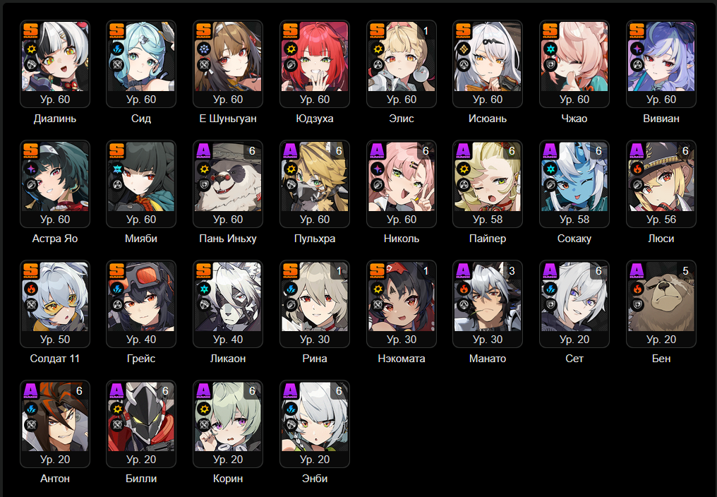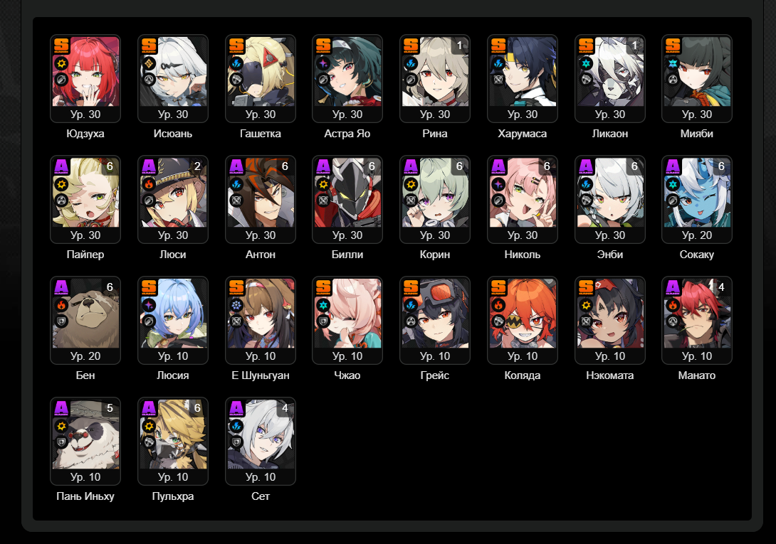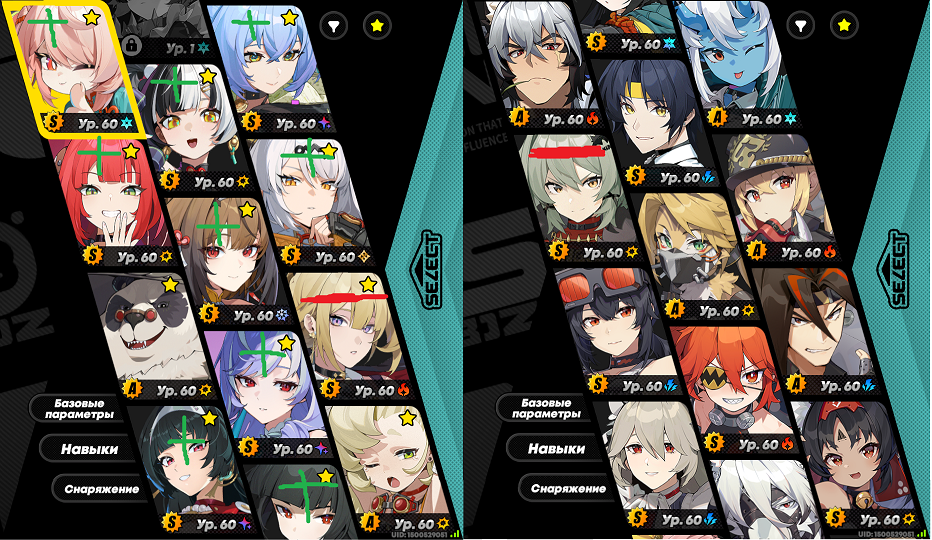 Мой ростер. Остальных лимиток нет. зеленый + это топ персонажи стоящие своих круток. Красный минус это говно парашное не стоящее круток(при чем на них сука скамило жестко, под 90 выкидывал на это говно ебаное)