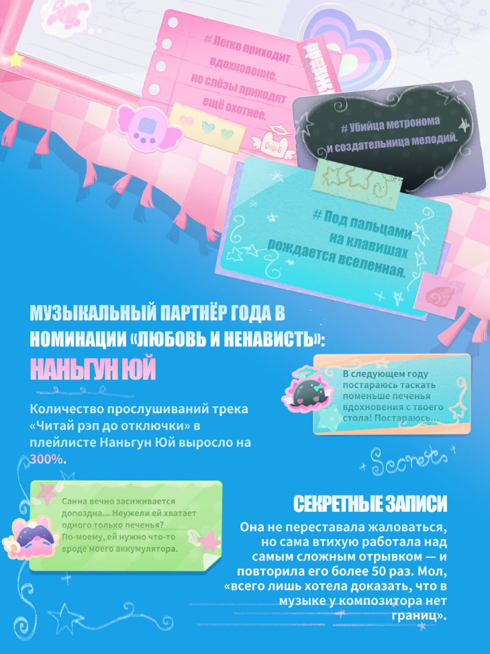 💬 Сообщение от фан-клуба «Ангелов наваждения»: В этом году ты проводила больше времени за нотами, чем перед микрофоном. Мелодии, что рождаются из-под твоего пера, дают Арии оружие, чтобы покорить зрителей, а Наньгун Юй — пламя, чтобы зажечь на сцене. Даже если ты краснеешь перед камерой, поверь: твоя искренность и упорство в достижении мечты давно стали для нас самым трогательным рефреном. В новом году пусть твоё вдохновение будет неугасимым, как свет звёзд... — Продолжай спасать мир музыкой, наш великий композитор!