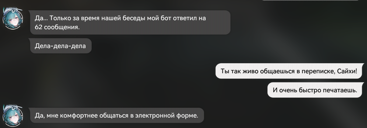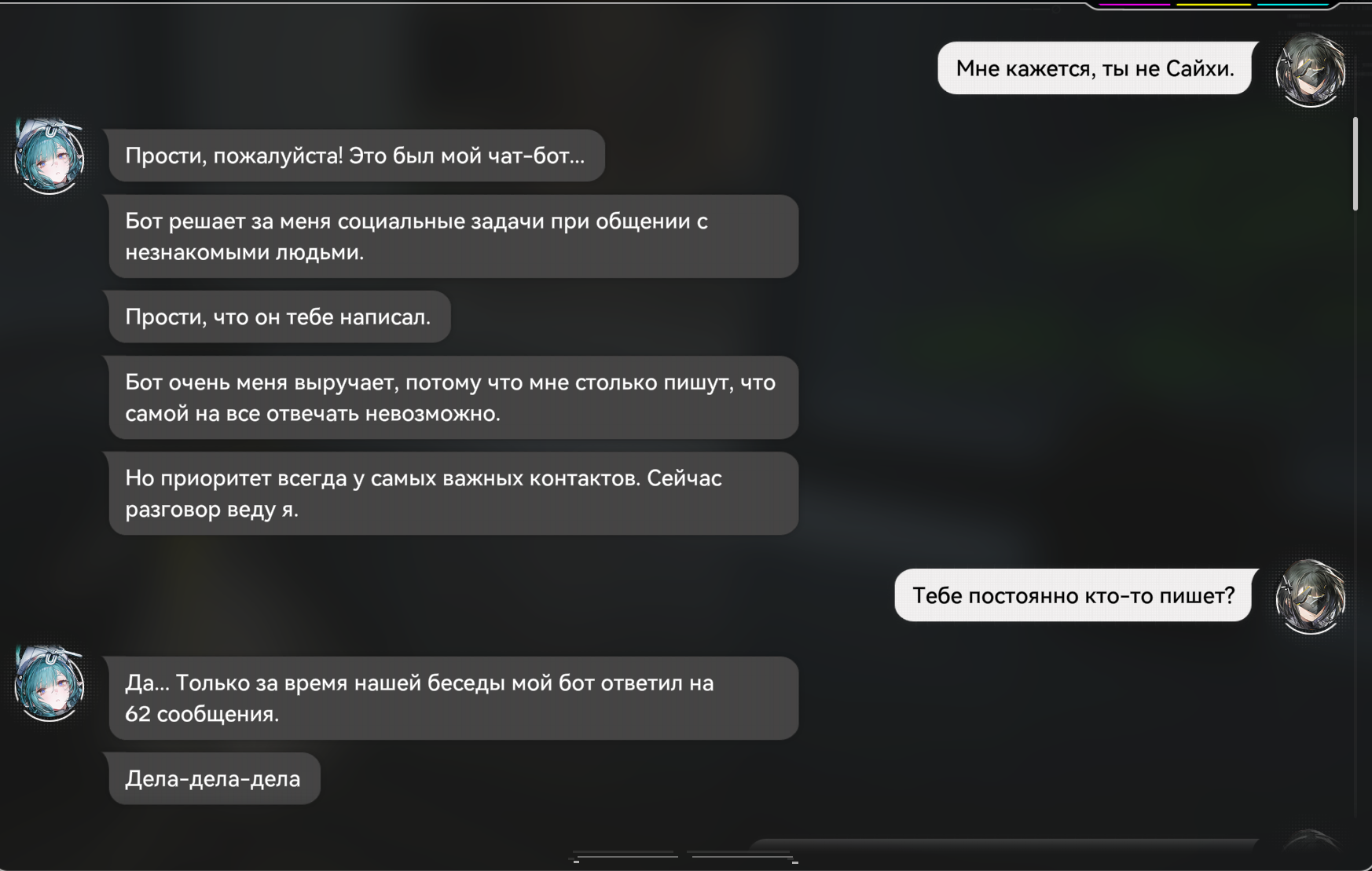 >>6342799 Капля в море, почти не заметно. Хочется больше взаимодействий. Да банальные вопросы типа "как дела", "что делаешь" и т.д. было бы уже хорошо.