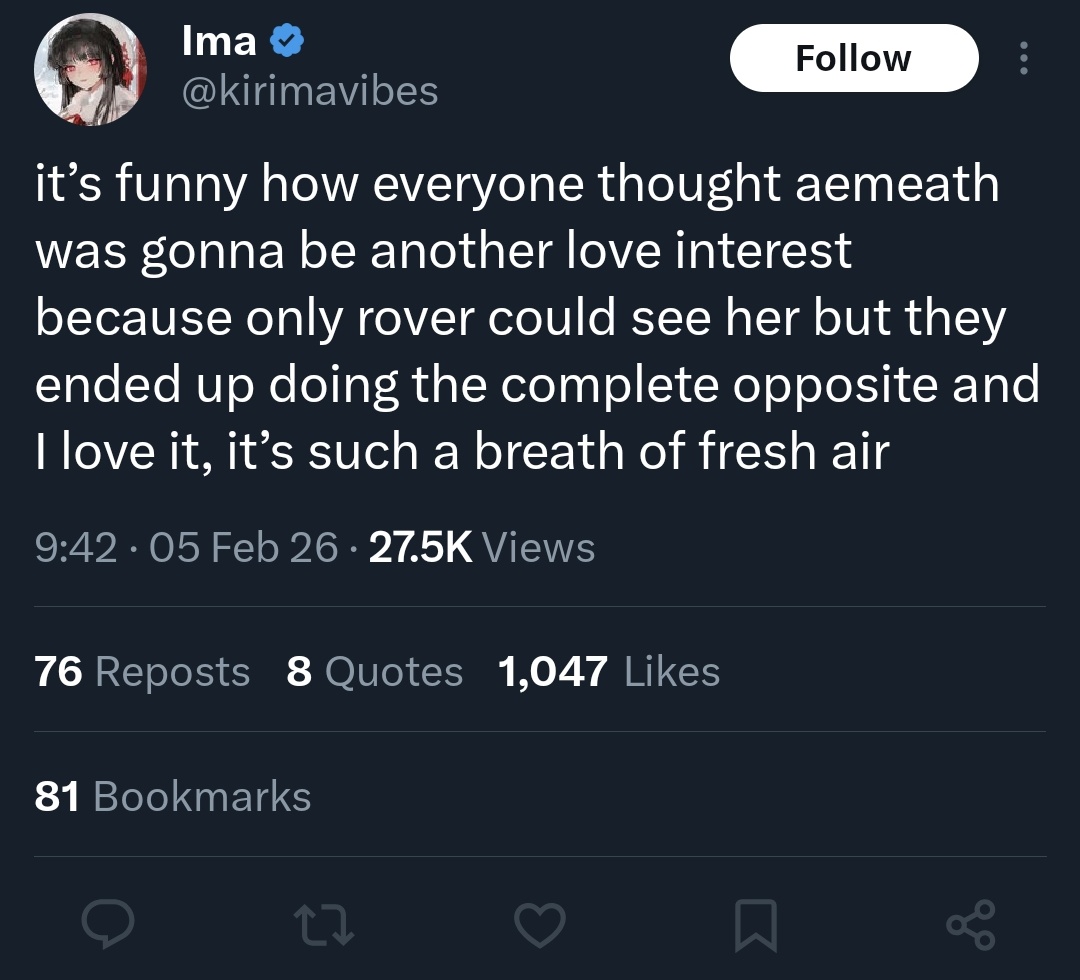 да прав, в нынешнем таймлайне эмет уже не видит в ровере "дитя" как раньше, это больше глубокая эмоциональная связь с романтическим подтекстом по канону, особенно после событий с черной берегой и ее воспоминаниями. в детстве мб было отеческим, но сейчас лор толкает на "любовь не по-семейному", чекни вики или архив лора в шапке, там все расписано без спойлеров.