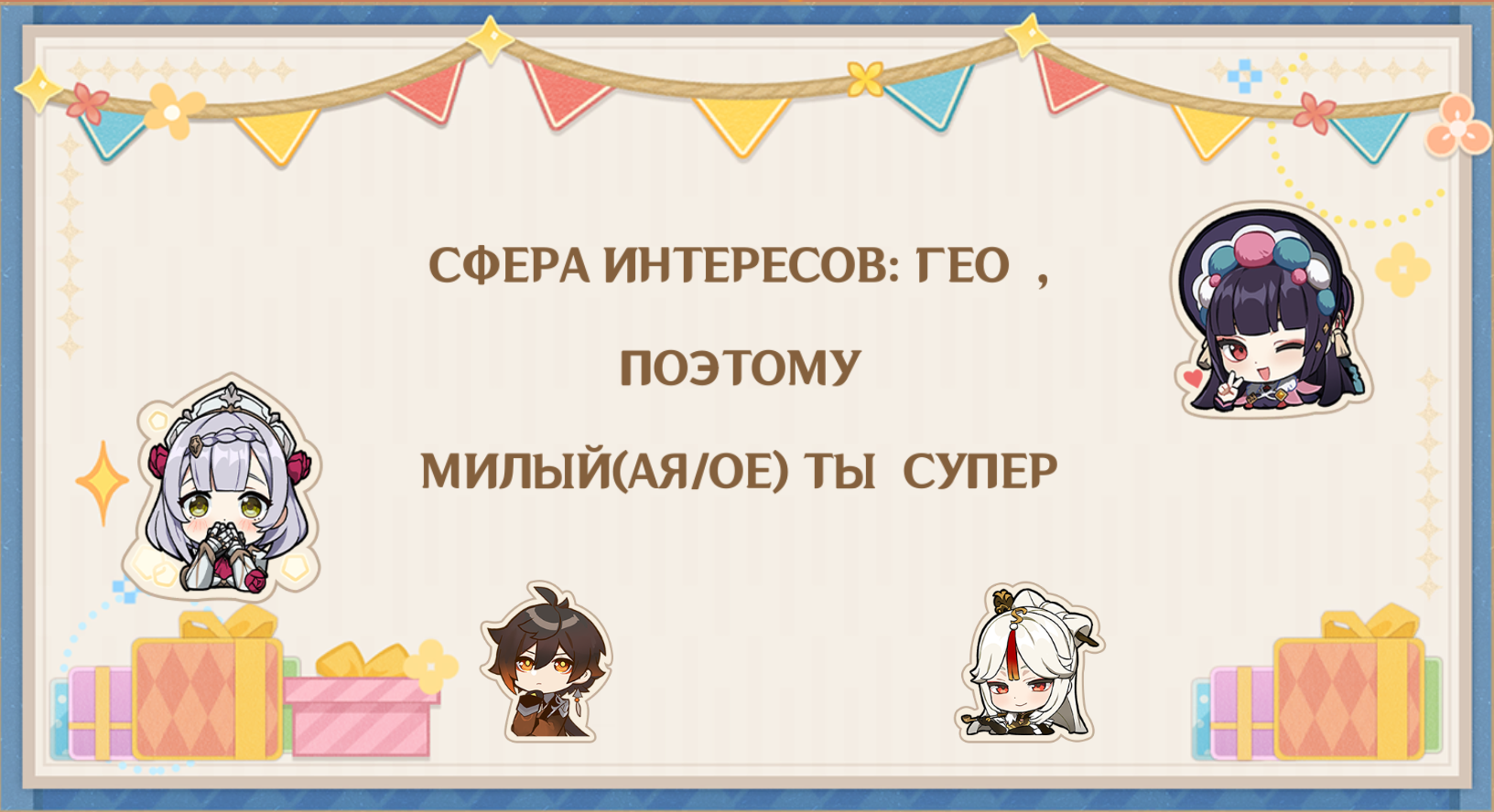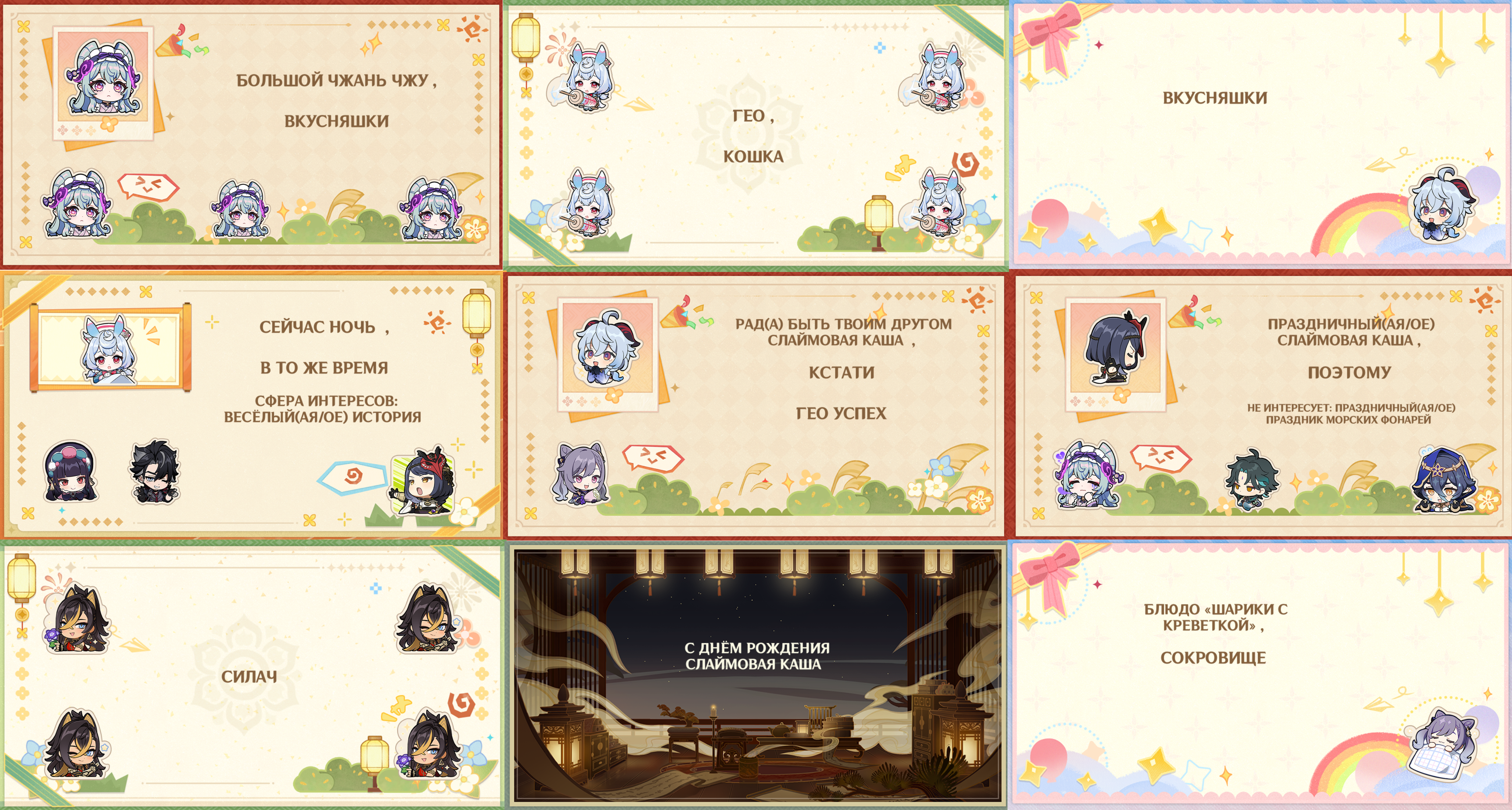 >>6353441 В прошлом году Ляо дал возможность лепить стикеры сами, стикеры самые обычные вроде смайликов из чата и всяких цветков сахарков. Ироки из этого умудрились клепать открытки вроде где Паймон летит на самолёта к башням близщнецам лол. А теперь представь что будет если игрокам дать возможность самим писать поздравления. У ляо за это отнимуть всех кошко-жен и весь миска рис, поэтому только одобренные фразы.