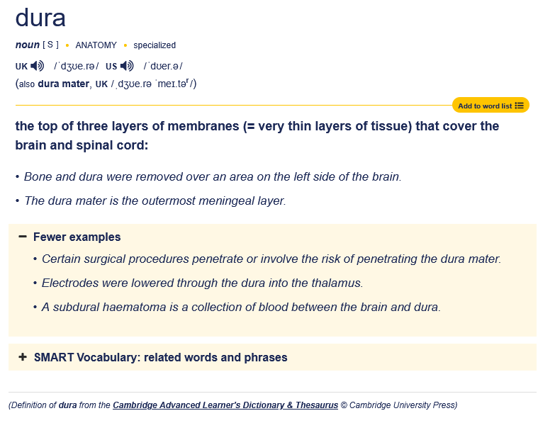 >>6358114 Дура - жесткая внешняя оболочка, обволакивающая головной и спинной мозг; верхний из трех слоев мембран (= очень тонких слоев ткани), которые покрывают головной и спинной мозг.