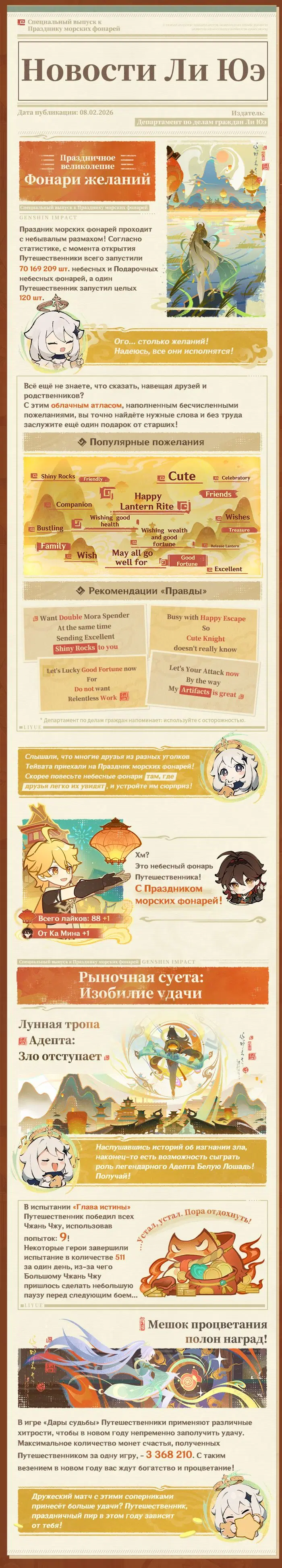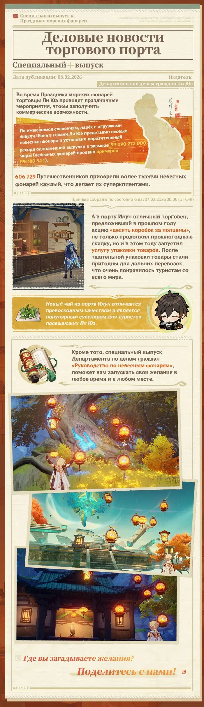 Прошла уже больше недели с начала праздника, и вдруг Паймон получила свежий экземпляр «Новостей Ли Юэ» от Департамента по делам граждан. Давай почитаем и узнаем, что нового было на Празднике морских фонарей в этом году.