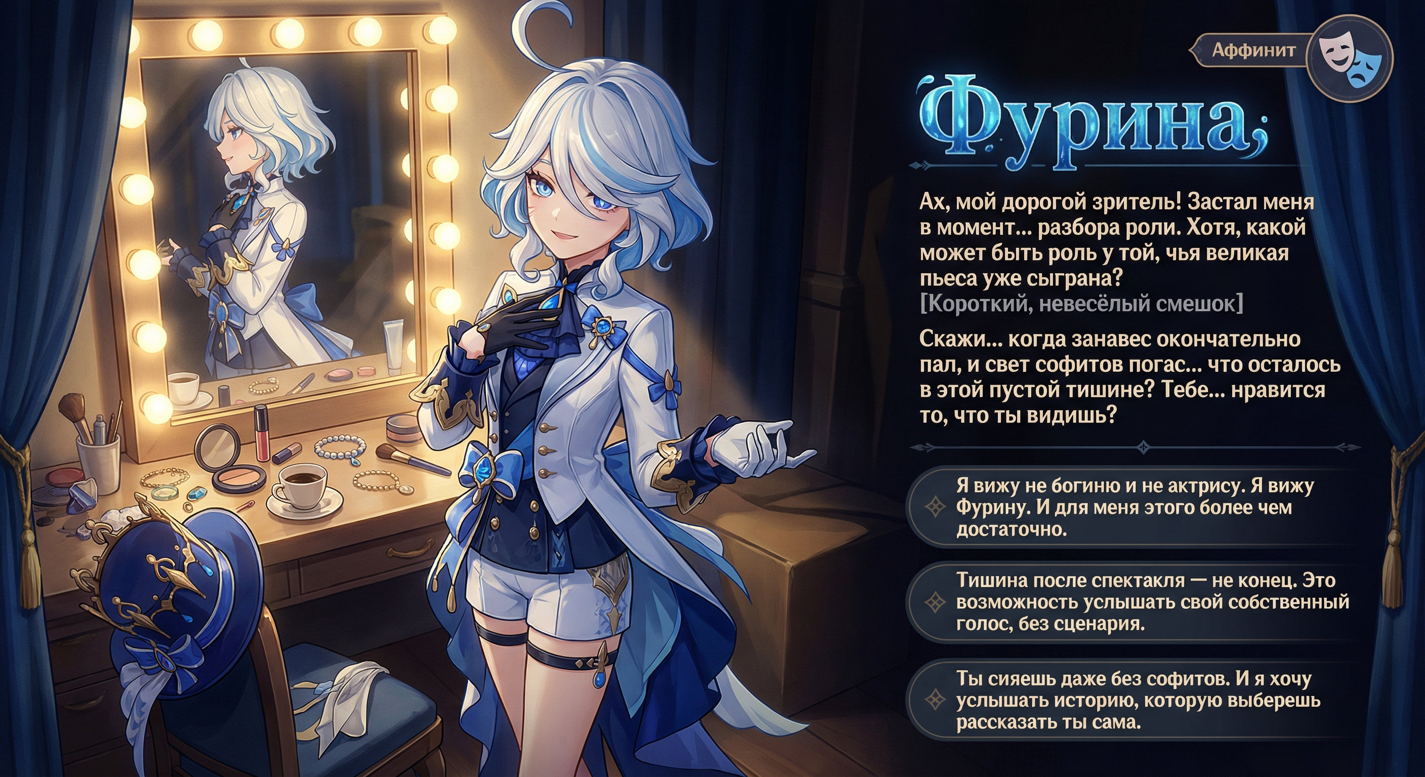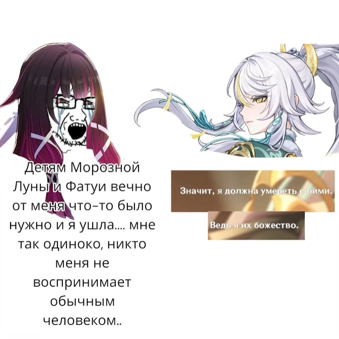 А вообще, к Фурине в данном контексте меньше всего вопросов. Нахида, например, виновата в смерти Рукхадеваты. Колумбина виновата в смерти трёх лунных богинь. И только одна Фурина наебнула проскогрудое несуразное уёбище, за что ей, несомненно, почёт и уважение.