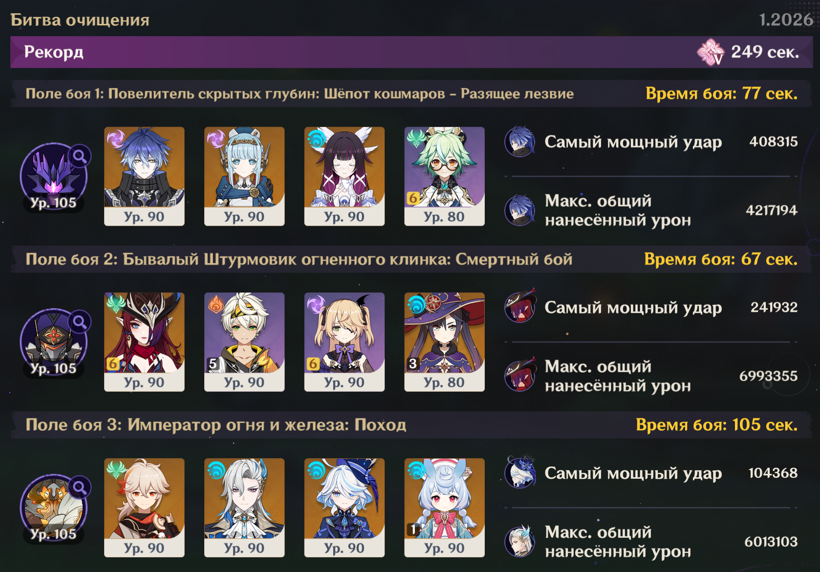 Не думал, что смогу еще улучшить таймер в этом надриске, учитывая убийство первого босса с Клумбой до второго щита, где-то за 90 сек. Но вот решил потраить старую пачку с четверками, только с инструктором на Айно вместо Дионы, чтоб стабильнее его активировать. Получилось неплохо казик напрокал я ебу как и вторая пачка, усиленная Клумбой вместо Айно, срезала на рассольнике больше 30 сек. В итоге -10 сек с общего таймера. Грустно конечно то, что даже новая ротация с лучшим аптаймом бафов в Неферпачке не позволяет пройти собаку без казика, но я еще потраю ради интереса, все таки было пару очень близких фейлов с 4зв бубликом из баннера.