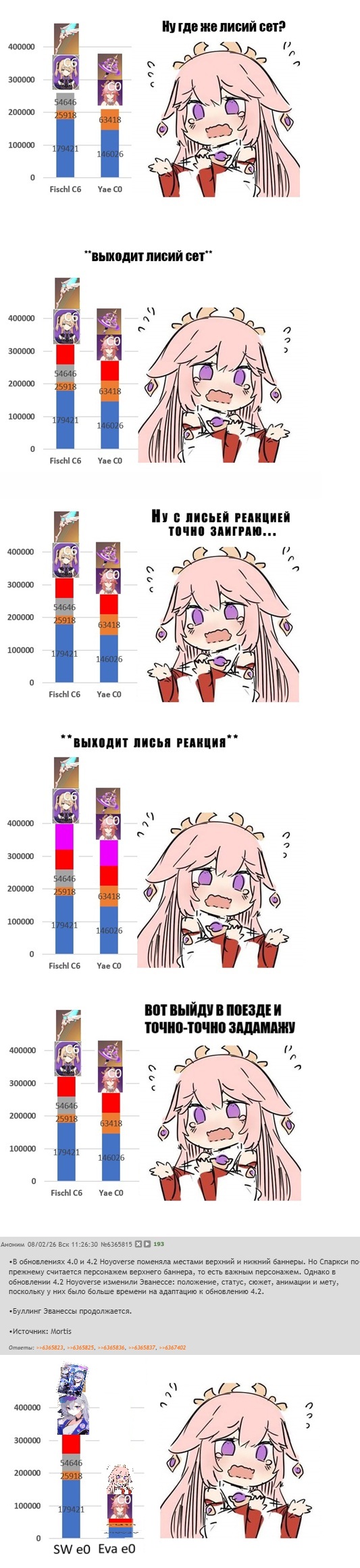 >>6367026 Вот мне интересно, ты и подобные тебе это по рофлу пишут: >(Илуга с6 = минимум 1.5 консты лимитки, а то и 2) или на серьезном лице? У тебя в голове ничего не щелкает, когда ты пишешь что с6 четверка, это две пятерки? Может ты эту четверку в отдельном баннере крутишь как пятерки к нефер? А куда интересно деваются все эти круточки на четверку, может они сгорают да? Если ты роллишь баннер лошади, то за иллугу с6 тебе еще с2 лошадь накинут сверху. У лошади самая дешевая пачка по косту, тк буквально все что ей нужно роллится в ее же баннере, а не отдельных баннерах пятерок. Ну клумба еще нужна с0р0, но она всем луновичкам нужна и обычно больше чем с0р0.