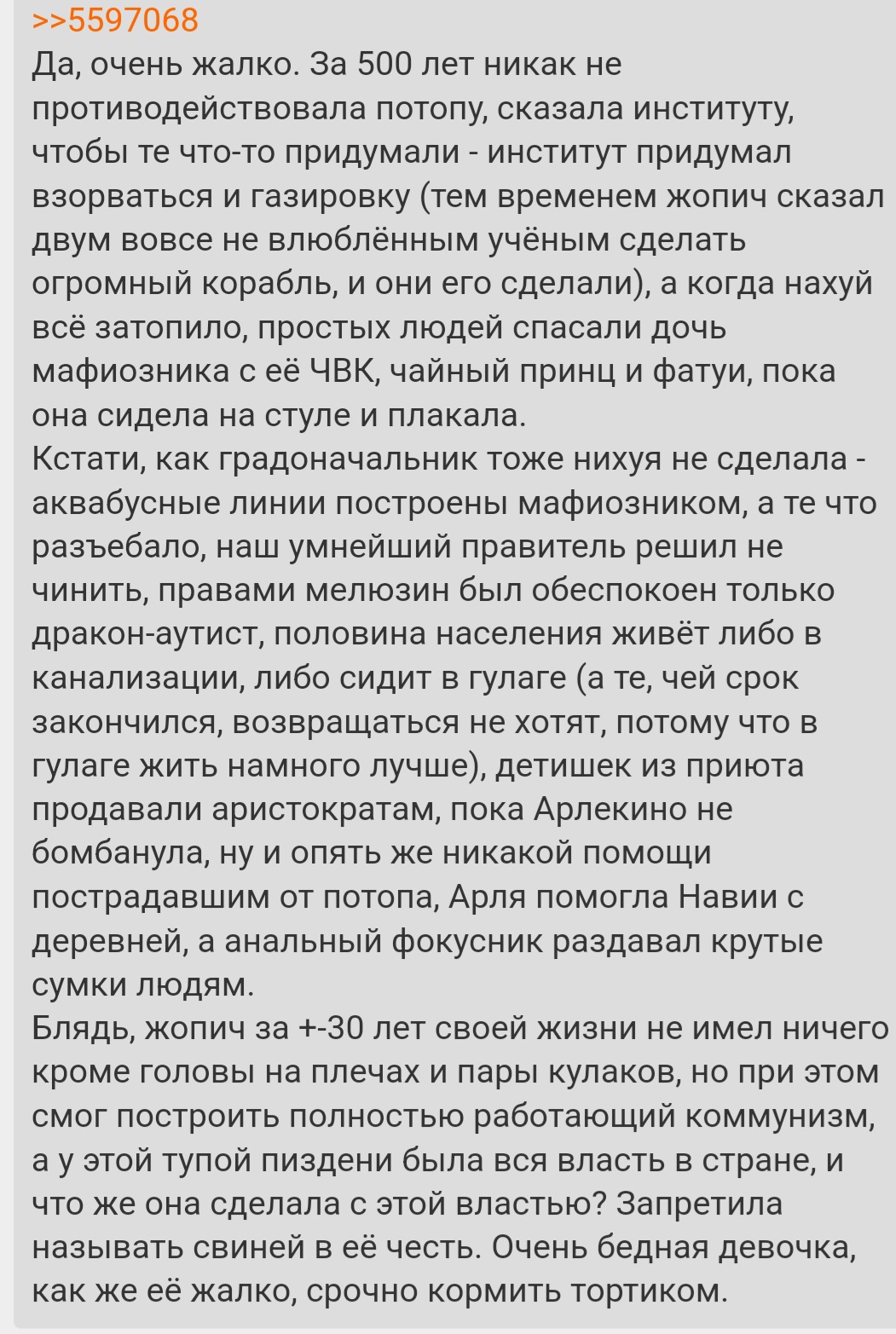 Ну, блядь, нужно чтобы она постоянно была в состоянии психоза, смеялась как джокир и рубила детей своей косой - иначе ца не понимает что с ней не так, видно на твоем примере. Надо не людей показывать, а шаблоны - этот хороший, этот плохой, никаких градаций и сложности, внутри злой организации общение исключительно агрессивными приказами и ультиматумами, за неподчинение или низкую эффективность - казнь на месте. От тогда сразу будет видно кто хороший кто плохой, и думать почему дружелюбная элегантная Арлечка которая помогает гг всё равно зашкварена - не нужно.