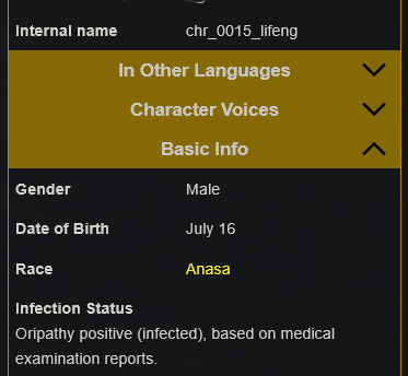 Similar to the Oni, the Anasa are a Teekaz offshoot that share a common ancestry with the Sarkaz. They and the Oni are believed to be the direct descendants of the tribes led by Qui'lon the "Errant Overlord" during his eastern migration thousands of years ago in order to search for a possible new land.[2][3] After Quilon's death, These remaining tribes were separated from the rest of the Sarkaz diaspora due to geographical isolation and Catastrophes, and they gradually evolved to a different culture and physical traits. Even though generations later they have settled in northwestern Yan and even changed their race's name, they still retain their own culture, such as practicing the Sarkaz's "witchcraft" and living a nomadic life in the wilderness.[4] Their common origin with the Sarkaz is even evident in their race's name which possesses an underlying meaning as "one without roots," a title given to the Sarkaz.[5]