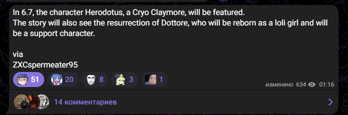 >>6387215 Датамайнинг не сливы. Сливы это когда ты в 6.3 говоришь о том, что 6.8 не будет, а в 6.7 будет персонаж крио-персонаж Геродот, ему в пачку нужны будут такие-то персонажи, делать он будет то-то, а ещё в сюжетке будет босс-вертолёт. Это сливы. А датамайнинг это другое.