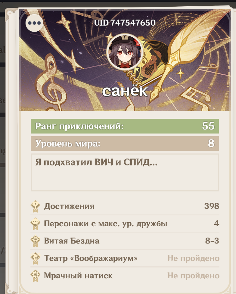 >>6386073 Я дальше 3 сложности не хожу и ещё на 12 этаж бездны не хожу. Разве что зоопарк позволяет в театре какие-то результаты показывать и там ещё у друзей можно взять с1 Арлекино или с2 Невилета или Скирк.