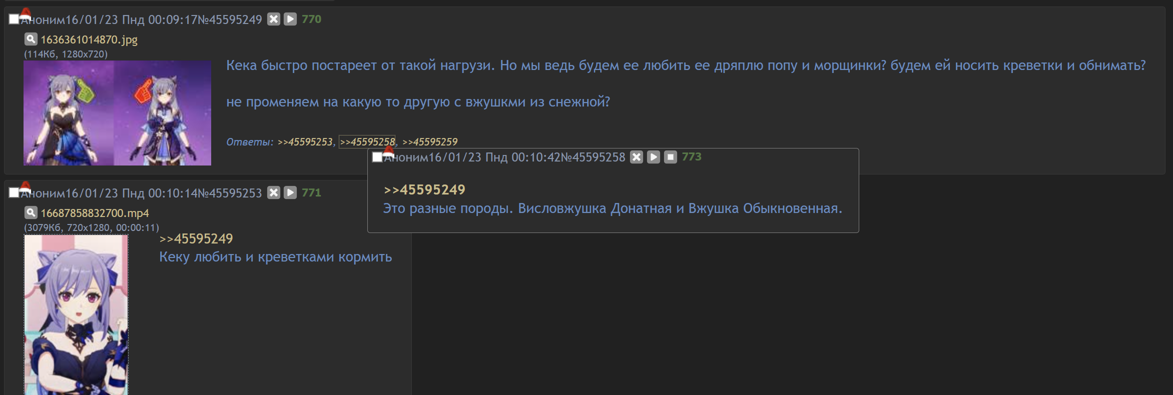 если честно, я даже не могу вспомнить когда последний раз видел персонажа кэ цин вне треда, и только щас задумался что это игровой чар был такой, у нее персоналити есть я ей играл даже, а теперь она ассоциируется только тупой вжушкой угарающей по креветкам, короче свели чара в какой то форс