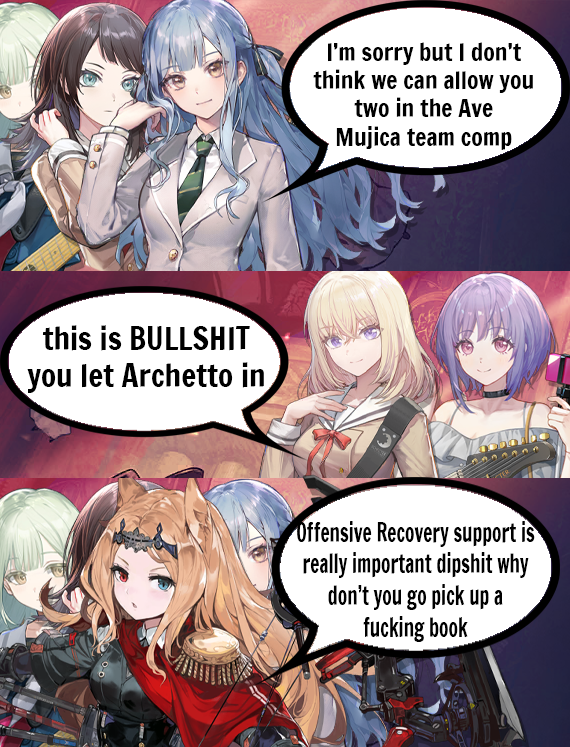 Я прошёл, используя только 5 членов Ave Mujica, все эксы кроме трёх случаев: 1. В SSEX3 на харде пришлось взять певичку Скади, а то там в час пик Сакико не успевала всех летающих убить, и летающие шары в синий куб пролетали; 2. В SSEX8 использовал Харуку, а то хила не хватает; 3. В SSEX8 на харде тоже использовал Харуку.