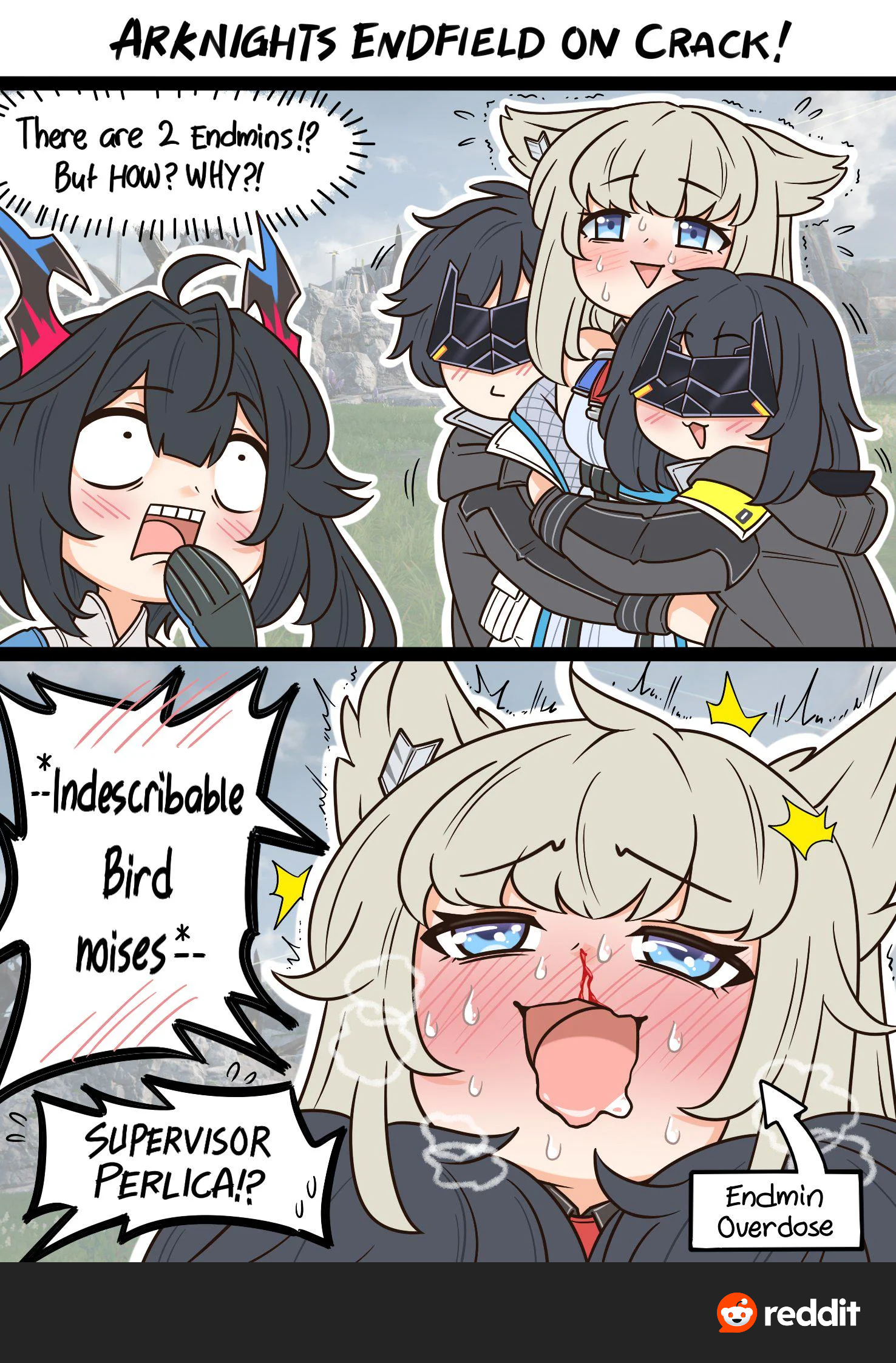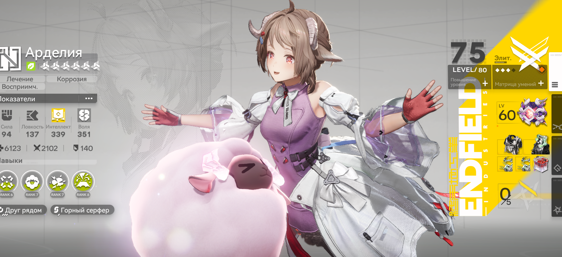 rhodes island - главная компания, лечиет зараженных, доктор (ты) - амнезиак тактик с бабой amiya (кроличья лоли-лидер), калтсит (неубиваемая кошара-старушка, твоя бывшая напарница по намёкам). перри (овца-учёная) и exorcist (бывший враг) - твои ассистентки. остальное - операторы-наёмники, шипы фанатские (exusiai x texas, silverash x nian, mudrock x someone), но канона с жёнами/сексом ноль, максимум "я её спасу" и backstory драмы. endfield - спин-офф на другой планете, но база та же.