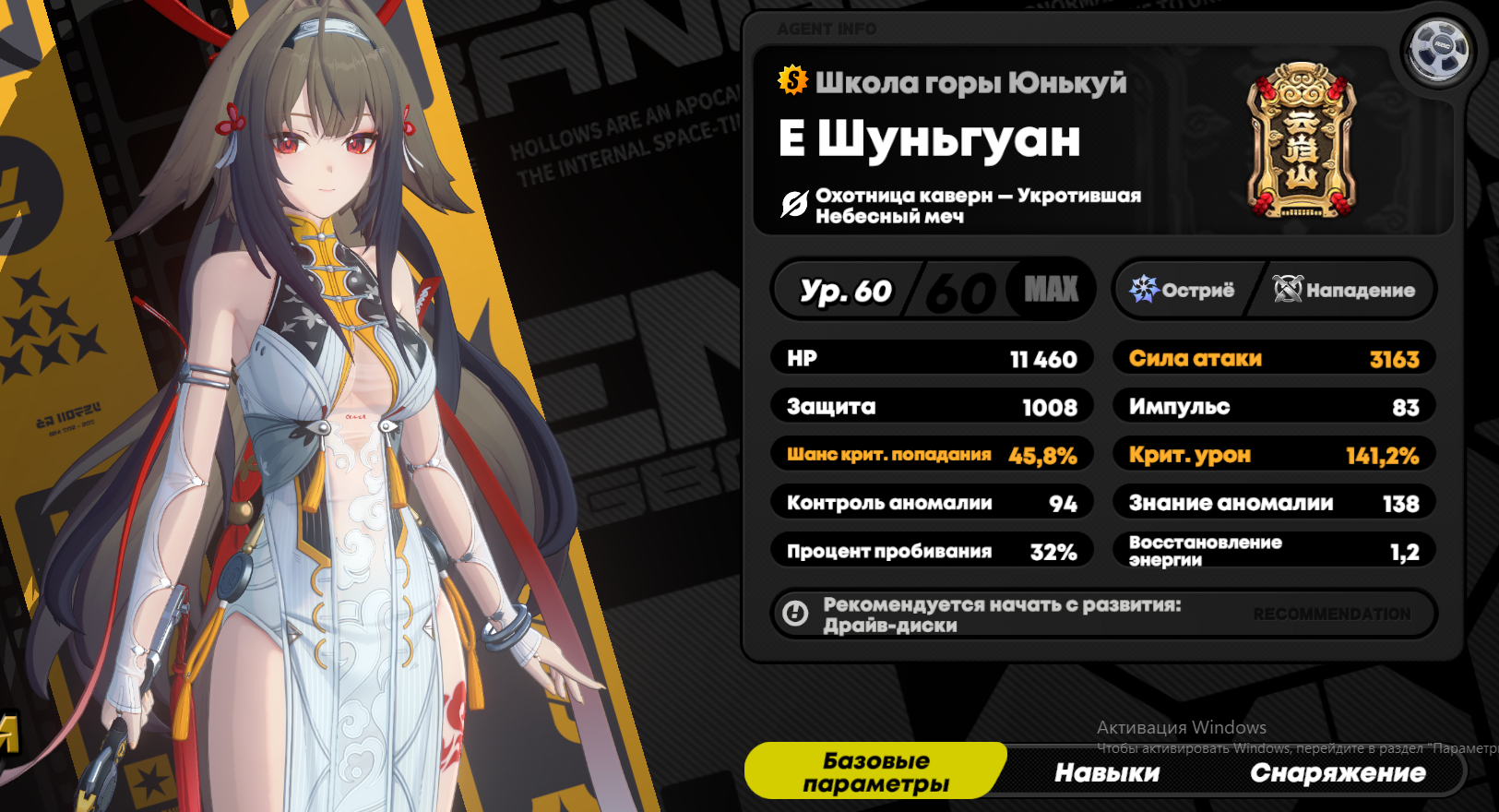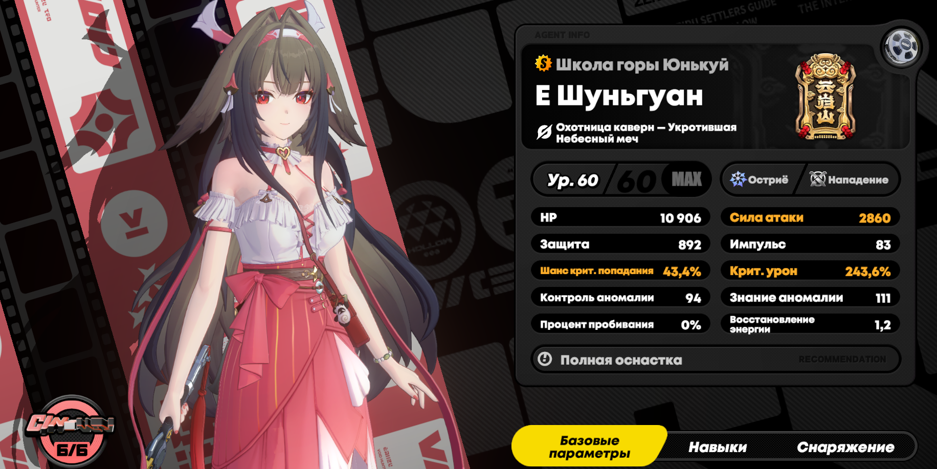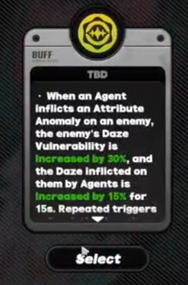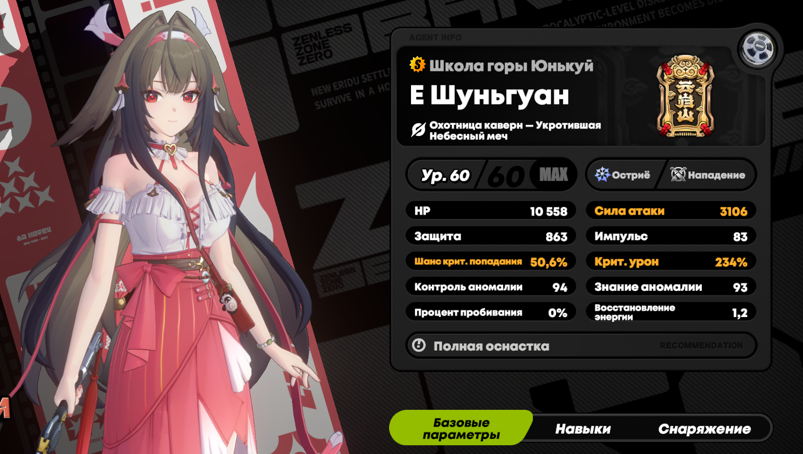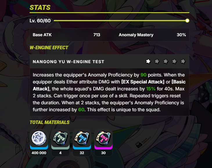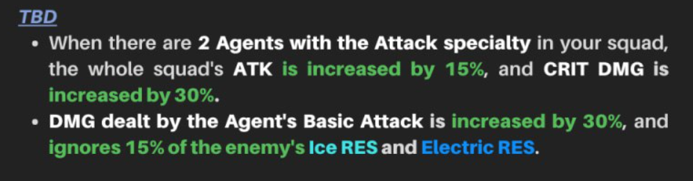 • Наньгун Юй — эфир станнер • В бою восстанавливает 6 Танцевальных очков; при наложении Аномалии любым союзником — ещё +35. • Заряженные атаки расходуют Танцевальные очки. • Суперспособность активирует Эфирную завесу: при её действии весь отряд получает +50 силы атаки. • При превышении порога контроля Аномалии повышает её импульс. • Оглушённый враг получает метку: при входе в Аномалию наносится выброс Аномалии или атака Беспорядка. Метка снимается при срабатывании Аномалии или окончании оглушения. • При снятии метки наносится урон 50% от исходного эффекта за каждый стак, с дополнительным усилением. • Попадание заряженной или усиленной особой атаки повышает накопление Аномалии и скорость оглушения. • При оглушении врага любым союзником множитель урона по оглушённым целям +15%. • Дополнительная способность: требует персонажей ангелов или аномалии. • Атаки по оглушённому врагу: +20% накопления Аномалии, цепная атака — +40%. • Когда тяжёлая атака активного агента попадает по врагу поражённого аномалией Атрибута, активирует эффект наносящий цели 40% урона Беспорядка.