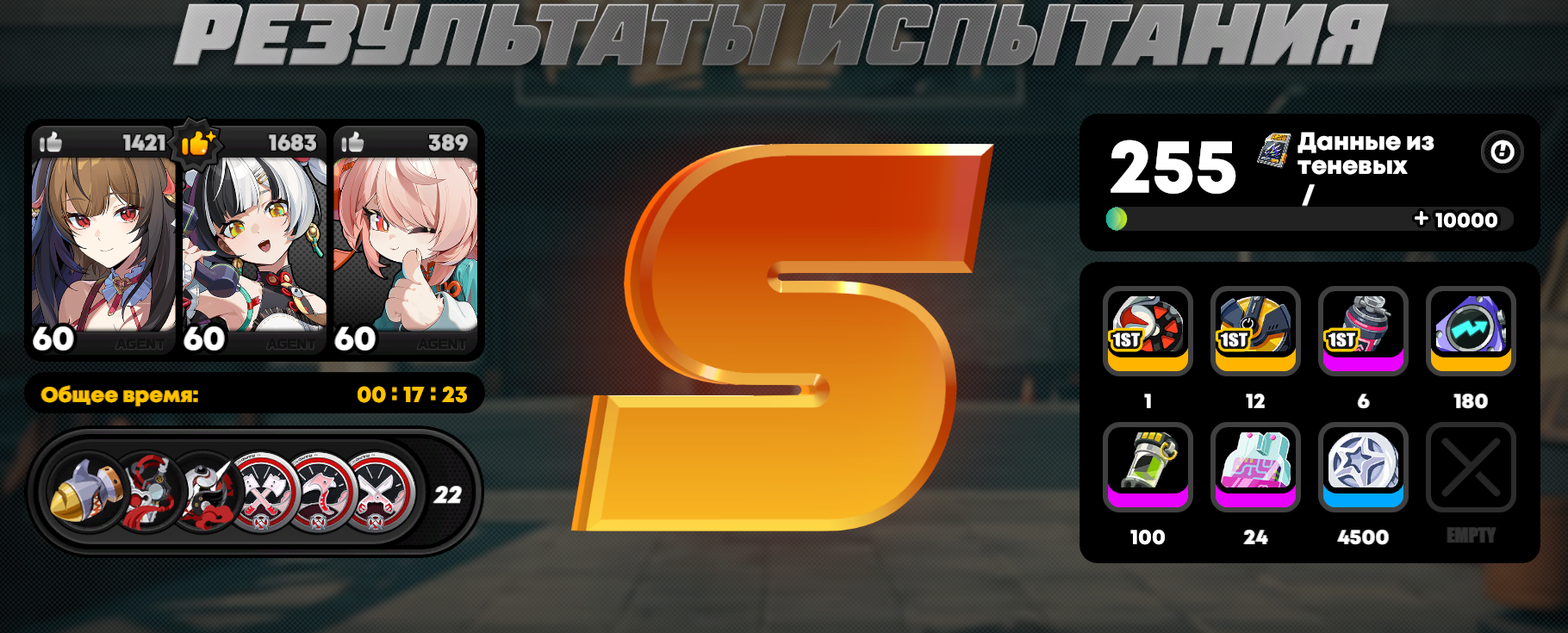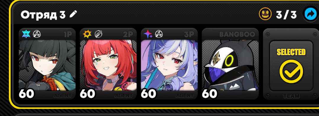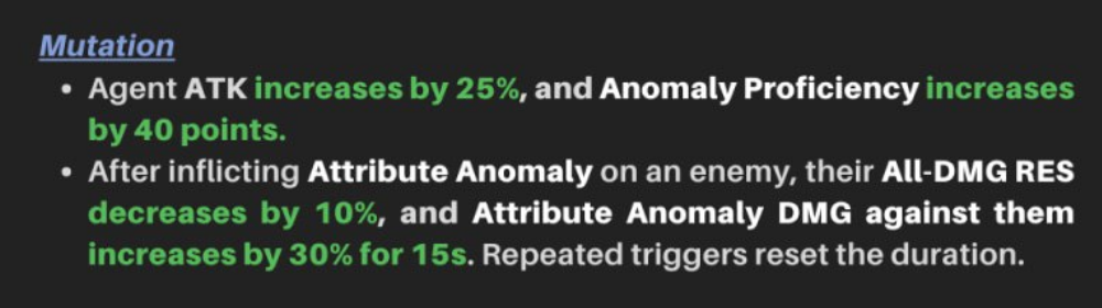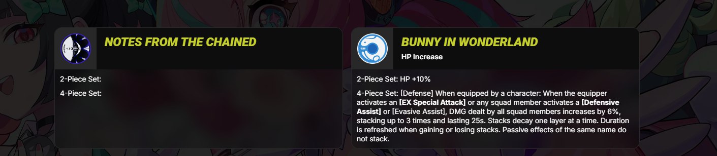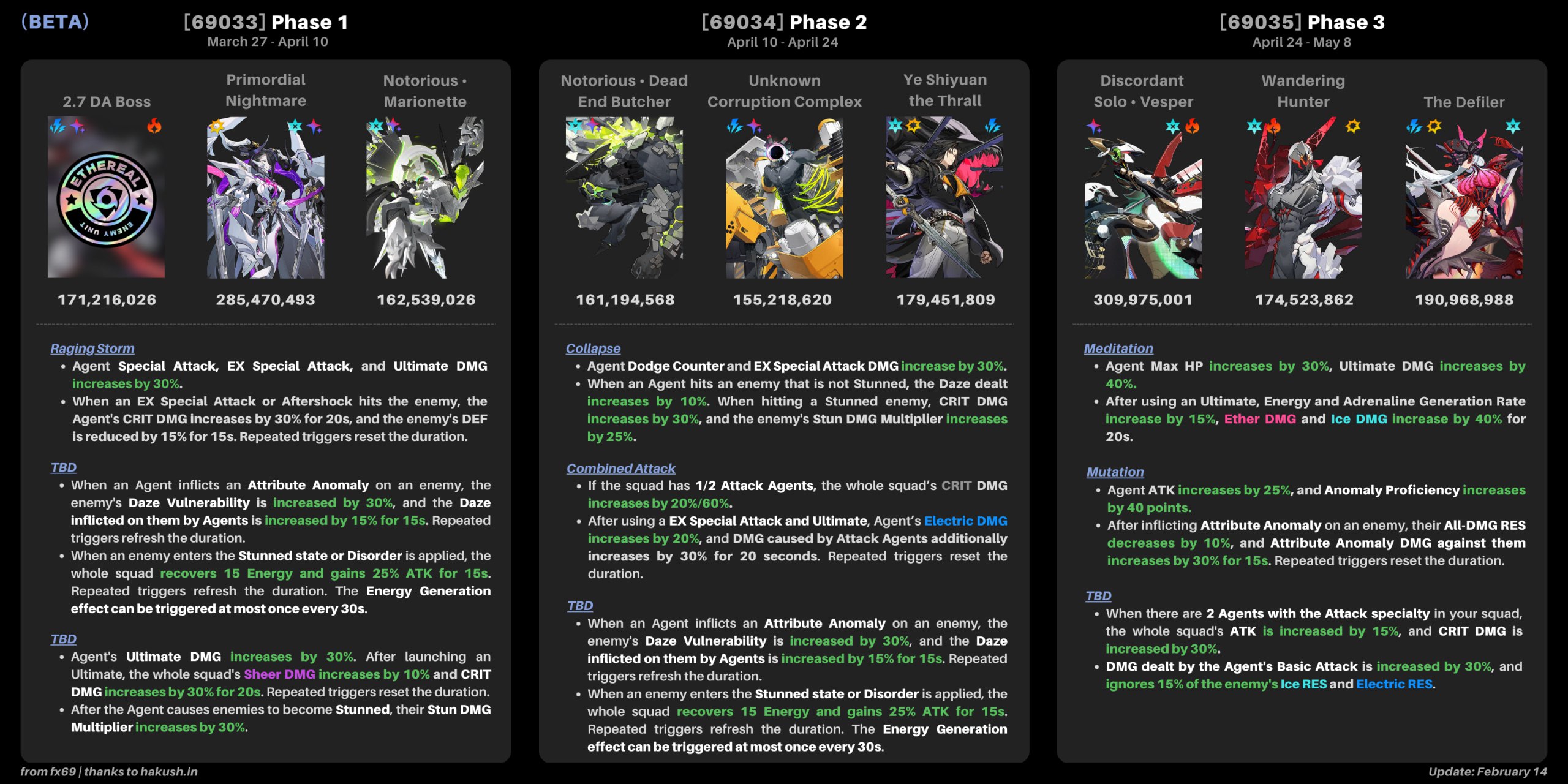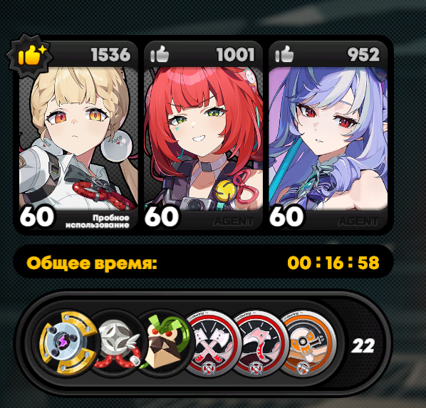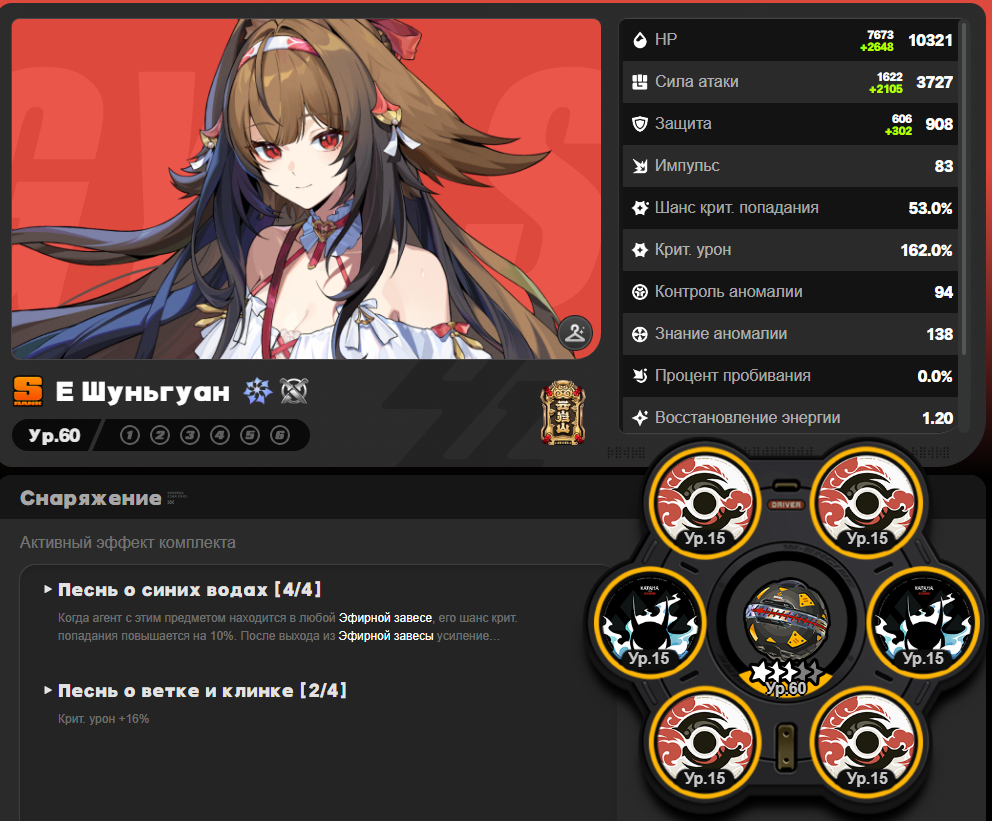• Наньгун Юй — эфир станнер • В бою восстанавливает 6 Танцевальных очков; при наложении Аномалии любым союзником — ещё +35. • Заряженные атаки расходуют Танцевальные очки. • Суперспособность активирует Эфирную завесу: при её действии весь отряд получает +50 силы атаки. • При превышении порога контроля Аномалии повышает её импульс. • Оглушённый враг получает метку: при входе в Аномалию наносится выброс Аномалии или атака Беспорядка. Метка снимается при срабатывании Аномалии или окончании оглушения. • При снятии метки наносится урон 50% от исходного эффекта за каждый стак, с дополнительным усилением. • Попадание заряженной или усиленной особой атаки повышает накопление Аномалии и скорость оглушения. • При оглушении врага любым союзником множитель урона по оглушённым целям +15%. • Дополнительная способность: требует персонажей ангелов или аномалии. • Атаки по оглушённому врагу: +20% накопления Аномалии, цепная атака — +40%. • Когда тяжёлая атака активного агента попадает по врагу поражённого аномалией Атрибута, активирует эффект наносящий цели 40% урона Беспорядка.