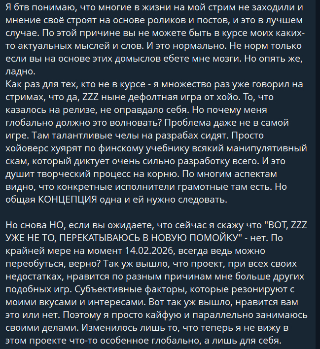 Зюзя ныне дефолтная игра от хойо. То, что казалось на релизе, не оправдало себя. Но почему меня глобально должно это волновать? Проблема даже не в самой игре. Там талантливые челы на разрабах сидят. Просто хойоверс хуярят по финскому учебнику всякий манипулятивный скам, который диктует очень сильно разработку всего. И это душит творческий процесс на корню. По многим аспектам видно, что конкретные исполнители грамотные там есть. Но общая КОНЦЕПЦИЯ одна и ей нужно следовать.