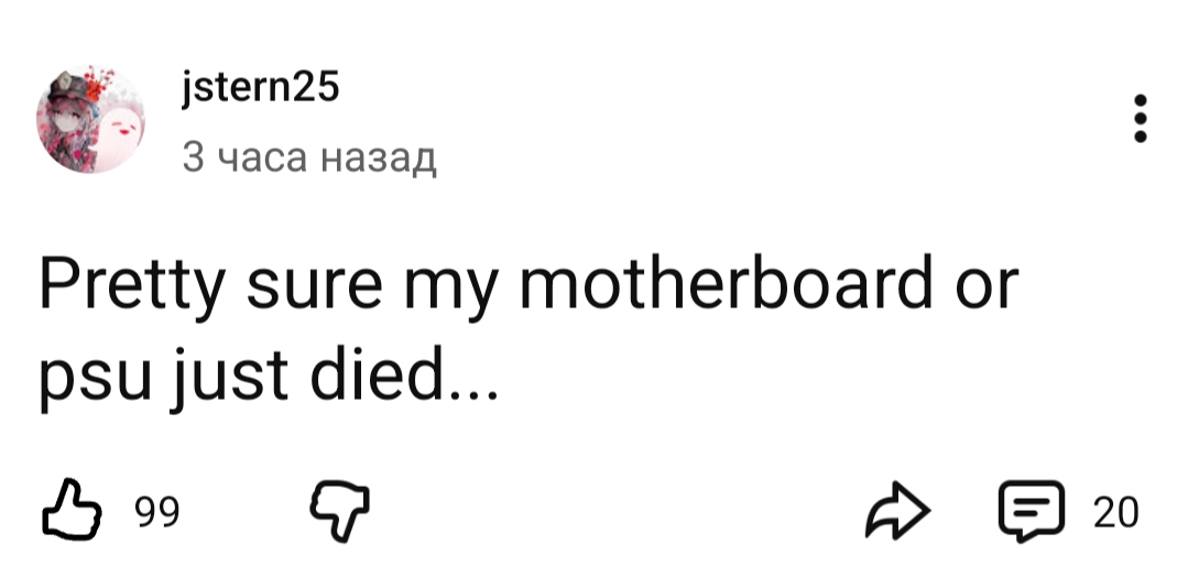 А чё сказать. Я 0 юшек даже за глина залутал, хотя даже самые тупые его посты набирают 3 юшки в среднем, значит всем максимально похуй на игру и тред щас.