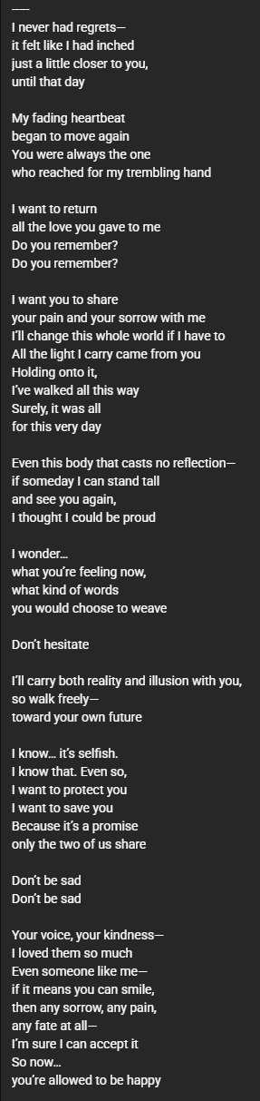 >>6415545 Гордо поднимусь, в руки меч возьму, чтоб сразить сердце тьмы! Даже если мне суждено в огне путь свой завершить! Всё смело отдам чтобы тебя вернуть. Долгий твой сон скоро прерву, дождись лишь.