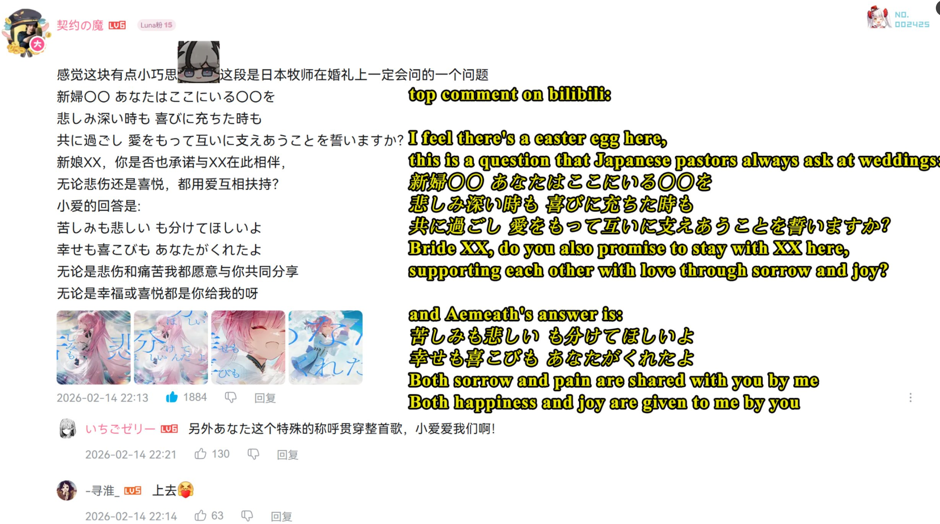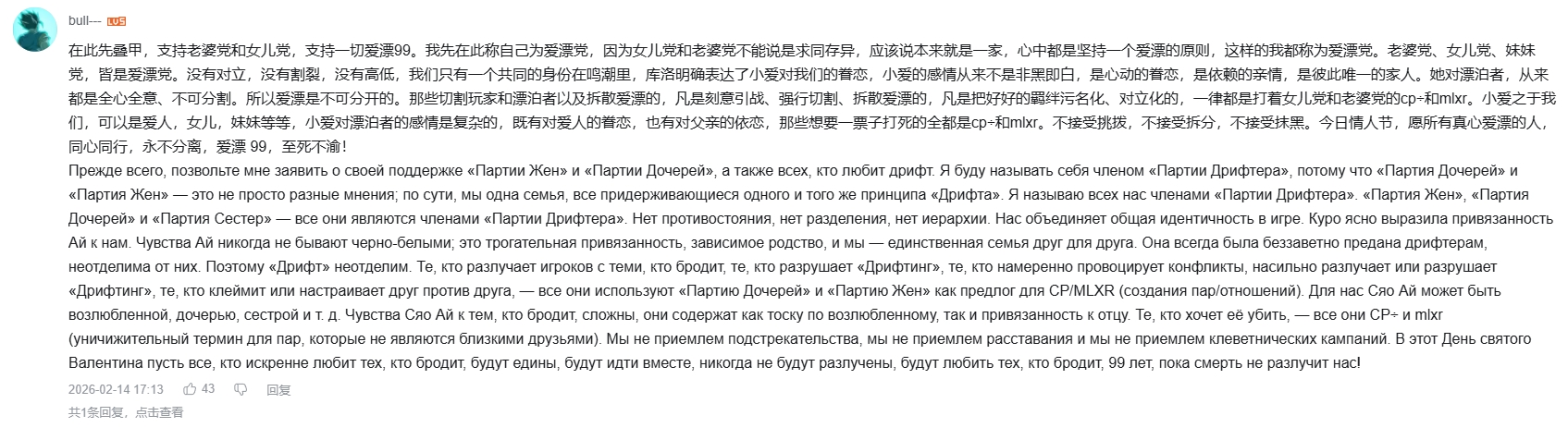 >>6416741 Вжушк. Какой же этот постер чертяка. Он вводит термин "爱漂99" как название "партии". Ноюанс в том, что 爱 [Ай] и 漂 [Пяо] это первые иероглифы в именах Эми и Ровера. Причём 爱 в отдельности это "любовь" (ну, кто бы из вас не знал). Кроме того, за числом 99 (по-китайски это "цзюцзю") кроется омофон к иероглифам 久久 [цзюцзю], т.е. "навечно/вечно/веки вечные" итд. Число "99" обычно используют как пожелание парам: "Будьте вместе навсегда!" Вкупе получается: 爱漂99 — "Эмет и Ровер вместе навеки" или "вечная любовь к Роверу" (если читать АЙ напрямую). Хотя в любом случае, смысл в общем и целом в том, что "爱漂99" это про абсолютную связь между ними двумя. Неважно, кто она — "жена", "дочь", "сестра" или "духовная половинка". Главное, что она принадлежит Роверу, а Ровер — ей.