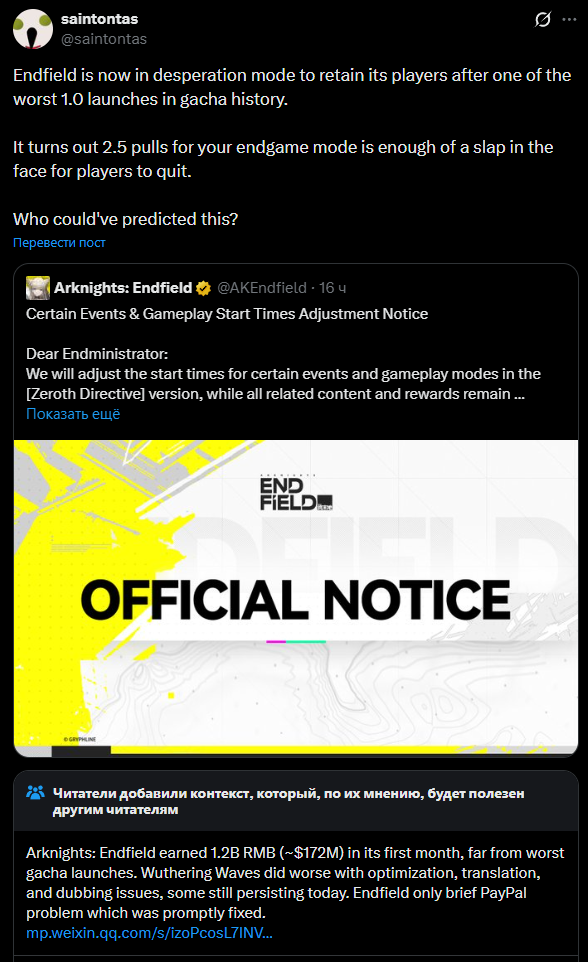 Бля, смешно читать про чулочников и всякие Базилеты когда первый баннер гавниша это буквально трап по методичке, все должны были знать на что шли, вжушк. По моему всеобщий консенсус что самый лютейший паверкрип начался с Натлана вместе со всякими мопедами, который по всем параметрам самым дерьмом оказался, от персонажей до сюжета, только занюх более менее был фановый. Я даже когда вернулся в Г этой осенью, охуел с того какие жирные мобы стали в дырках по сравнению с тем что было.