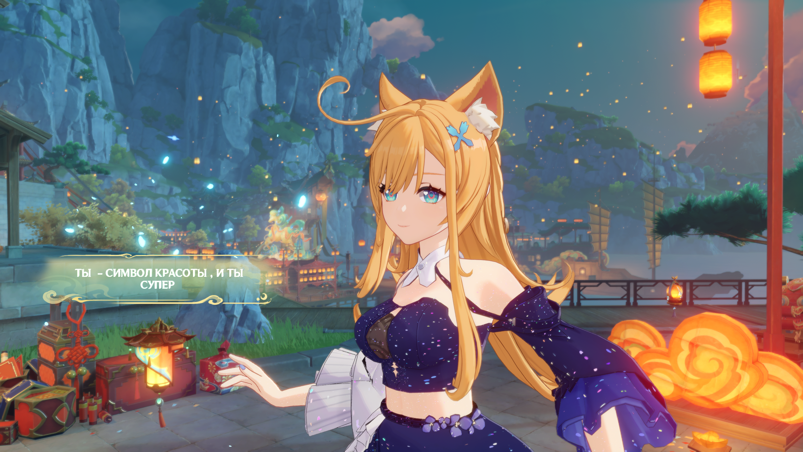 ✨ Посмотрите, как эти малыши развешивают украшения у дверей и запускают небесные фонарики. Они превратили гавань Ли Юэ в сверкающую сокровищницу, полную сияния и жизни! 🎉 А? Хочешь, чтобы я тоже сказала пару благословений? Традиция встречать новый год действительно не меняется уже тысячи лет. Хорошо. Пожелаю, чтобы в будущем году весенние дожди шли вовремя, летнее солнце грело ласково, а осенние морозы не губили побеги... И когда благодатный снег вновь покроет крыши, пусть огни тысяч домов Ли Юэ всё так же горят, как сегодня.
