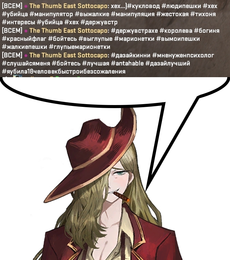 >>6428188 >С лейхуем непонятки Решу тупо пытался спровоцировать. А так Капо слушал, Измаиль даже предупредил чтобы завалила пиздак заместо того чтобы оторвать челюсть прям там. Хоть и быдловатый был, но явно свое место знал. Но он пЫнки и один из 12 клинков востока может отсюда и понты появились. У Тамба так и не объяснили принцип их феодальной лестницы, ну кроме того что они свои правила ко всем применяют. >индекс не вписывается в этот список Так Индекс любимцы Джихуна. Риен - трагедия, любимец КУМЬЮНИТИ. И опять Индекс перетянул на себя все одеяло сюжета. Все остальные там статисты для галочки чтобы мы посмотрели как плохо живут статисты, которым предписание запрещает срать больше одного раза в год.