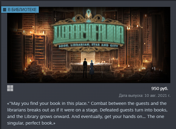Library Of Ruina: https://store.steampowered.com/app/1256670/Library_Of_Ruina/ Продолжение истории предыдущей игры. Собирайте книги с жителей города, чтобы приблизиться к сбору той самой Единственно Верной Книги. Всё, что от вас требуется - собирать колоды, билды, получать пизды и превозмогать трудности, что вам представляет Город. Всё приправлено огромным тазиком сюжета.