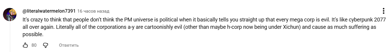 >>6487781 Претендование на что либо - это чисто твои догадки. Что было сказано - буквально является правдой. Оно было сказано не в том контексте, который важен/воспринимаешь лично ты, потому и стандартам этого контекста не должно было соответствовать. >>6487798 Чел на скрине сказал, что это очевидно, что калпорации в рамках ПМ Лора злые. Анон намекнул (исключительно исходя из своих ожиданий), что чел тупой лицемер, из-за того что он не упомянул кал лаборицию Жидхуя с Хёндаем. Когда одно из другого не следует потому что одно это описание происходящего в сюжете, а другое оценка моральной последовательности автора с произведением.