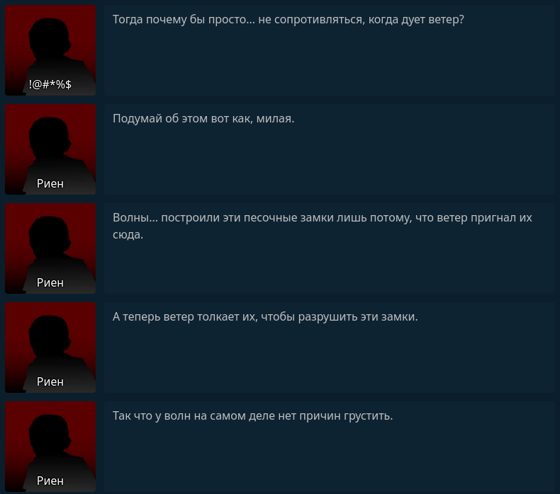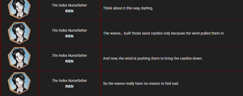 А Риен оказывается на самом деле был психом, хотя это и очевидно было, в нурсфазерах норм челов нет, а тредовчане будто бы и пропитались грустью к такому злодею, не поняв настоящего его.