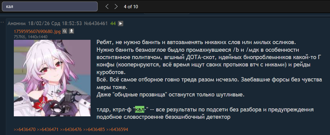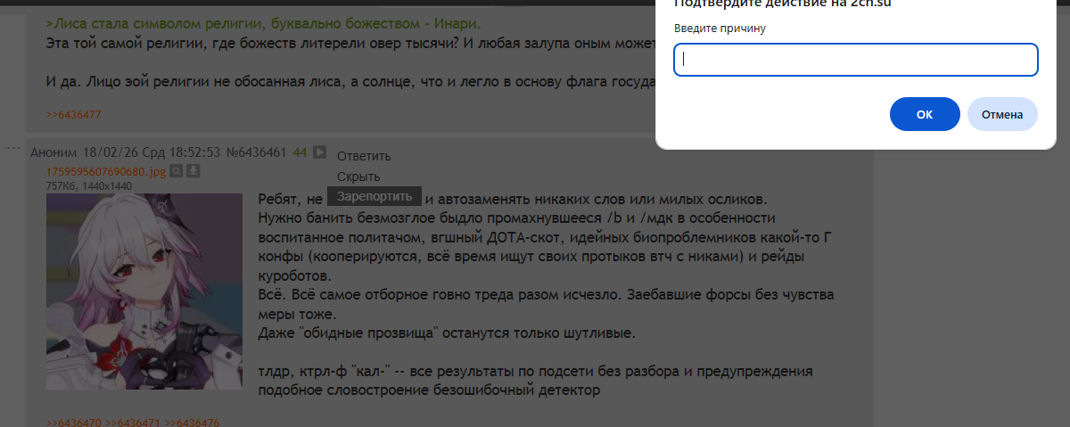 Ребят, не нужно банить и автозаменять никаких слов или милых осликов. Нужно банить безмозглое быдло промахнувшееся /b и /мдк в особенности воспитанное политачом, вгшный ДОТА-скот, идейных биопроблемников какой-то Г конфы (кооперируются, всё время ищут своих протыков втч с никами) и рейды куроботов. Всё. Всё самое отборное говно треда разом исчезло. Заебавшие форсы без чувства меры тоже. Даже "обидные прозвища" останутся только шутливые.