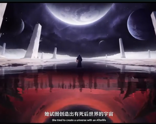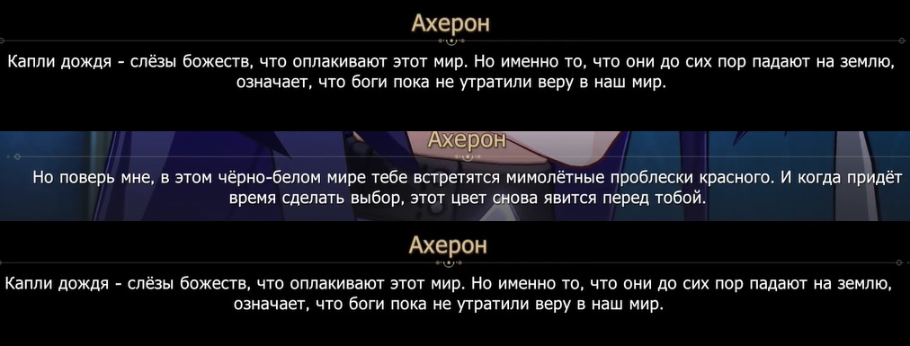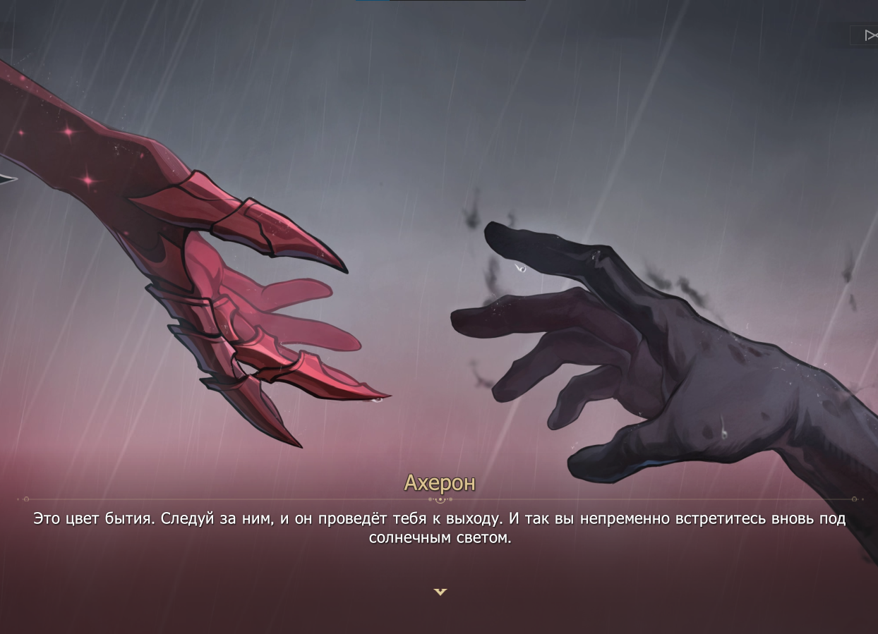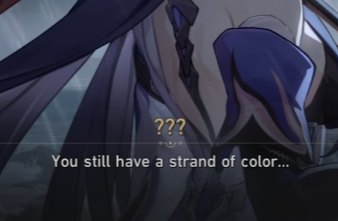 Она говорит о том, что Эонам не безразличен этот мир, что он не безнадёжен и имеет право на существование. Он не должен кануть в Небытие. Чёрно-белый олицетворяет бессмысленность. А проблеск красного. Тот цвет, что держит тебя в нём, твоё якорь. Именно красный, потому что она говорит через контекст личного опыта, этот цвет связан с её самым драгоценными воспоминаниями в этой жизни и именно он удерживает её от пропасти Девятого.