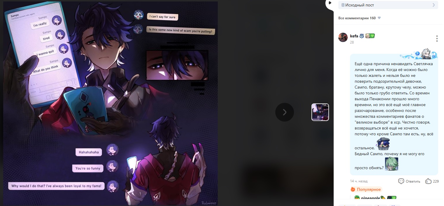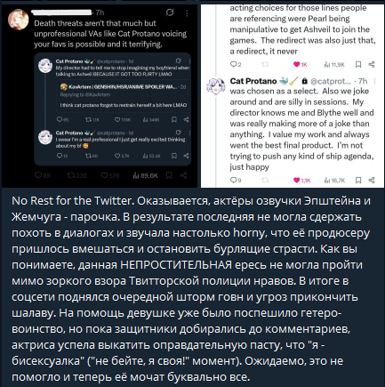 Твиттер проклятое место. Актриса озвучки Жемчуг представляла своего парня, озвучивая реплики в сторону Эшвейла. На работе ей сделали замечание, что фразы из-за этого звучат слегка кокетливо. Вроде как забавная и милая история. Теперь шизы ее отменяют из-за навязывания гетеросексуальной пары в сюжете. Честное слово, актриса озвучки Брони в свое время сделали МастерМайнд мув - представилась псевдонимом, ни в какой соц сети не сидит и просто делает работу. Подробнее об этом аде можно почитать тут: https://www.reddit.com/r/HonkaiStarRail/comments/1r88yhl/pearls_va_harassed_for_a_harmless_comment_yet/