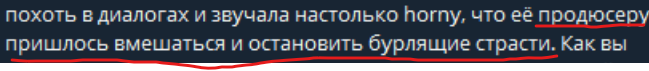 >>6440025 нет, это не мило и забавно, это ломает авторский замысел и окрашивает повествование в ненужные выдуманные тупой пиздой на озвучкере/режиссере/контент-менеджере нотки. Она ведь в твиттере еще намеренно срать начала всей этой шизой про Эша, дело не только в кокетливом тоне. Работа переводчика - переводить. Иногда адаптировать, но оставлять нетронутым контекст и авторский замысел, что у дебилов в англюсике не сохраняется почти никогда и которые могут себе позволить всякие идиотские мувы в тексте добавляя свое