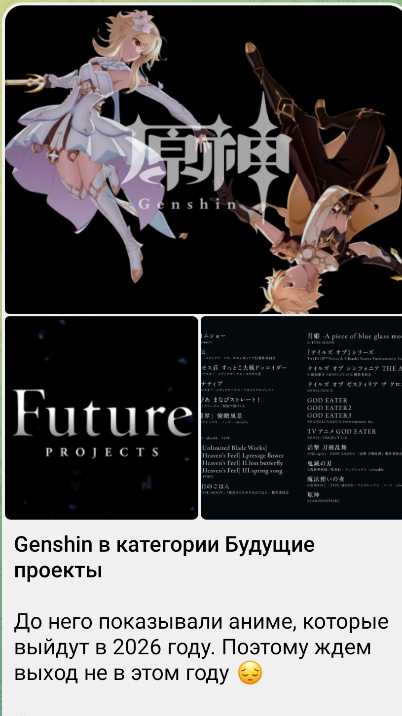 На видео четко и ясно сначала идут анонсы аниме на 2026 год, которое уже готово. А Геншиноаниме - это "future project" в отдельной категории хуй знает когда.