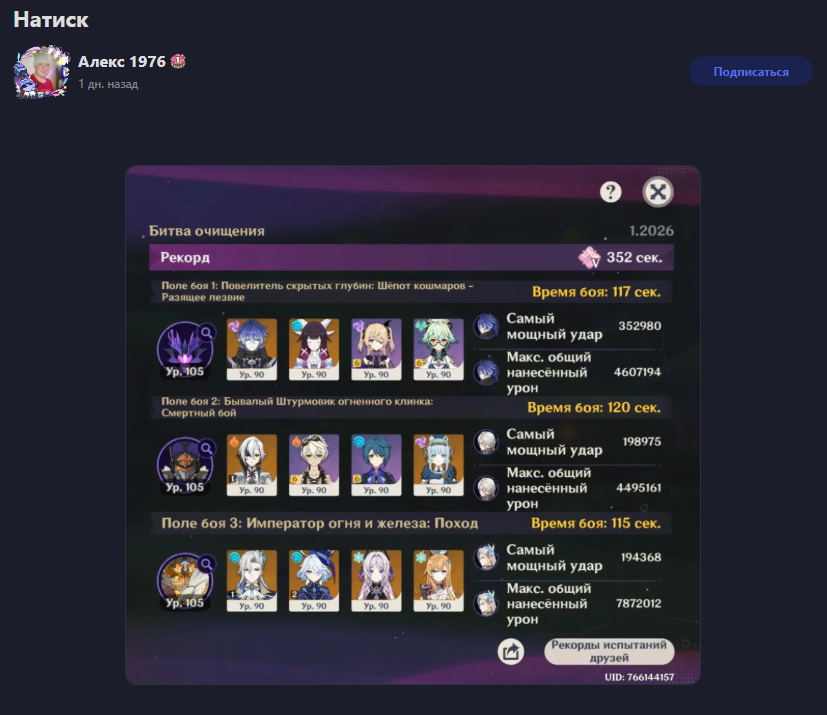 Так и играю либо Арлей, либо Ху Тао, с Елань и Фуриной уже года два. На бездну забил, но при желании на 6 звезд закрывал 12-й этаж.